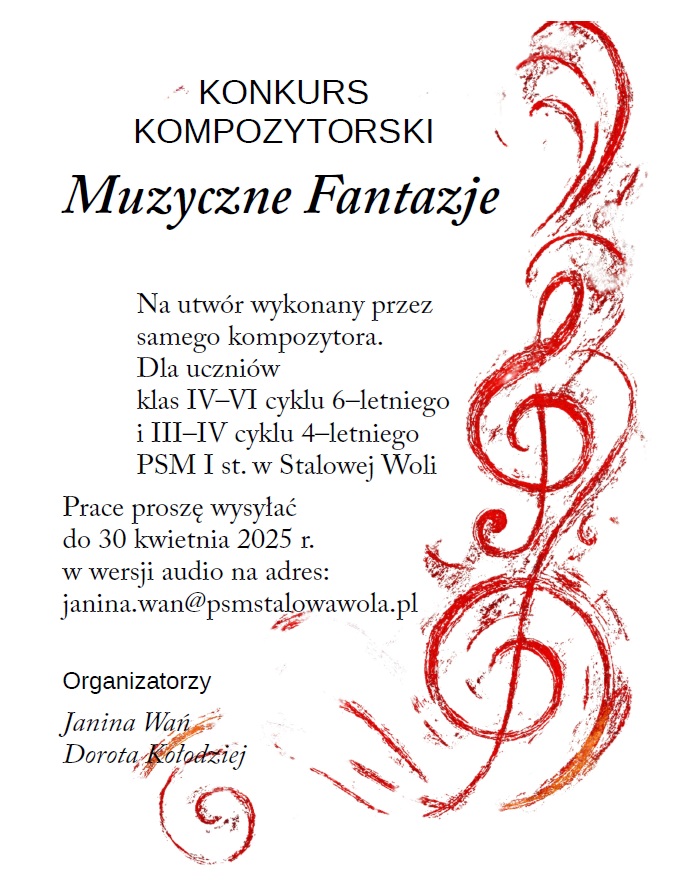 Zapraszamy wszystkich uczniów wybranych klas Szkoły Muzycznej I stopnia w Stalowej Woli do udziału w wyjątkowym konkursie kompozytorskim "Muzyczne Fantazje". To doskonała okazja, aby zaprezentować swój talent, kreatywność i muzyczne wizje.