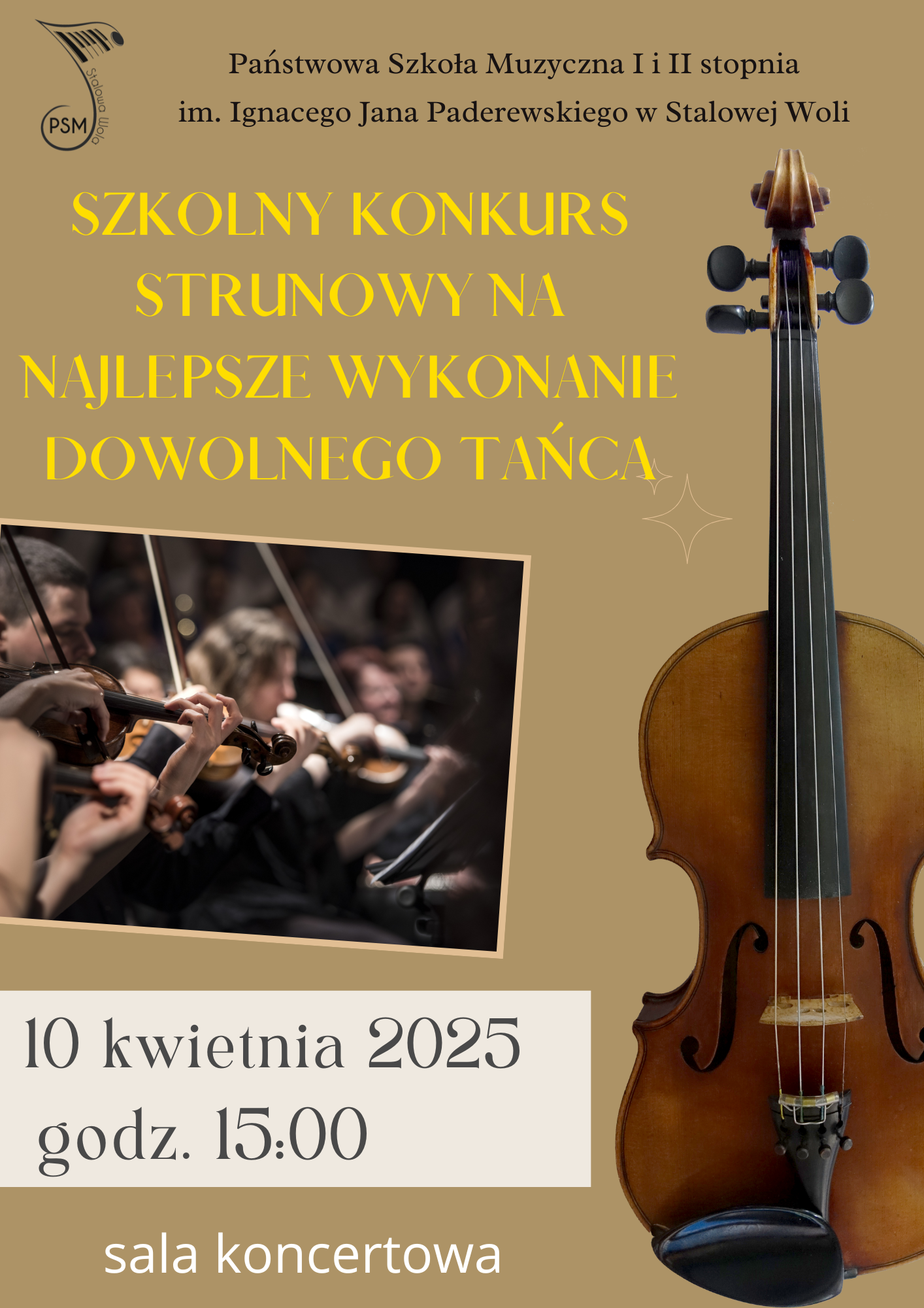 Z ogromną przyjemnością zapraszamy na wyjątkowe wydarzenie artystyczne organizowane przez Państwową Szkołę Muzyczną I i II stopnia im. Ignacego Jana Paderewskiego w Stalowej Woli - Szkolny Konkurs Strunowy na Najlepsze Wykonanie Dowolnego Tańca.