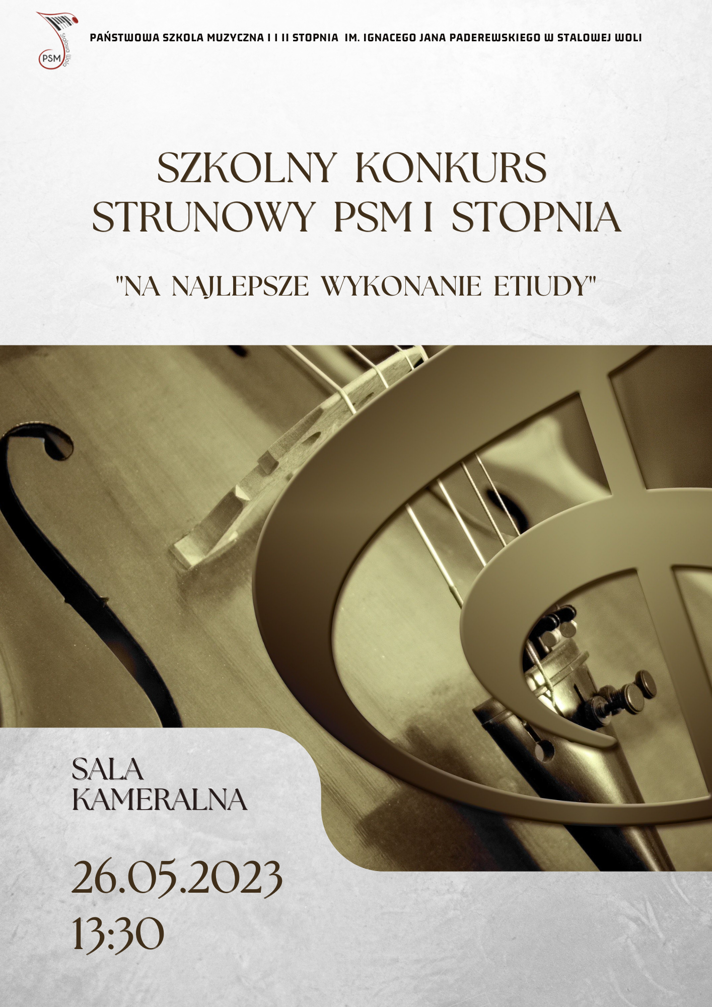 W dniu 23 maja 2023 r. o godzinie 13:30 w sali kamernalnej odbędzię się Szkolny Konkurs Strunowy PSM I stopnia "Na najlepsze wykonanie etiudy".