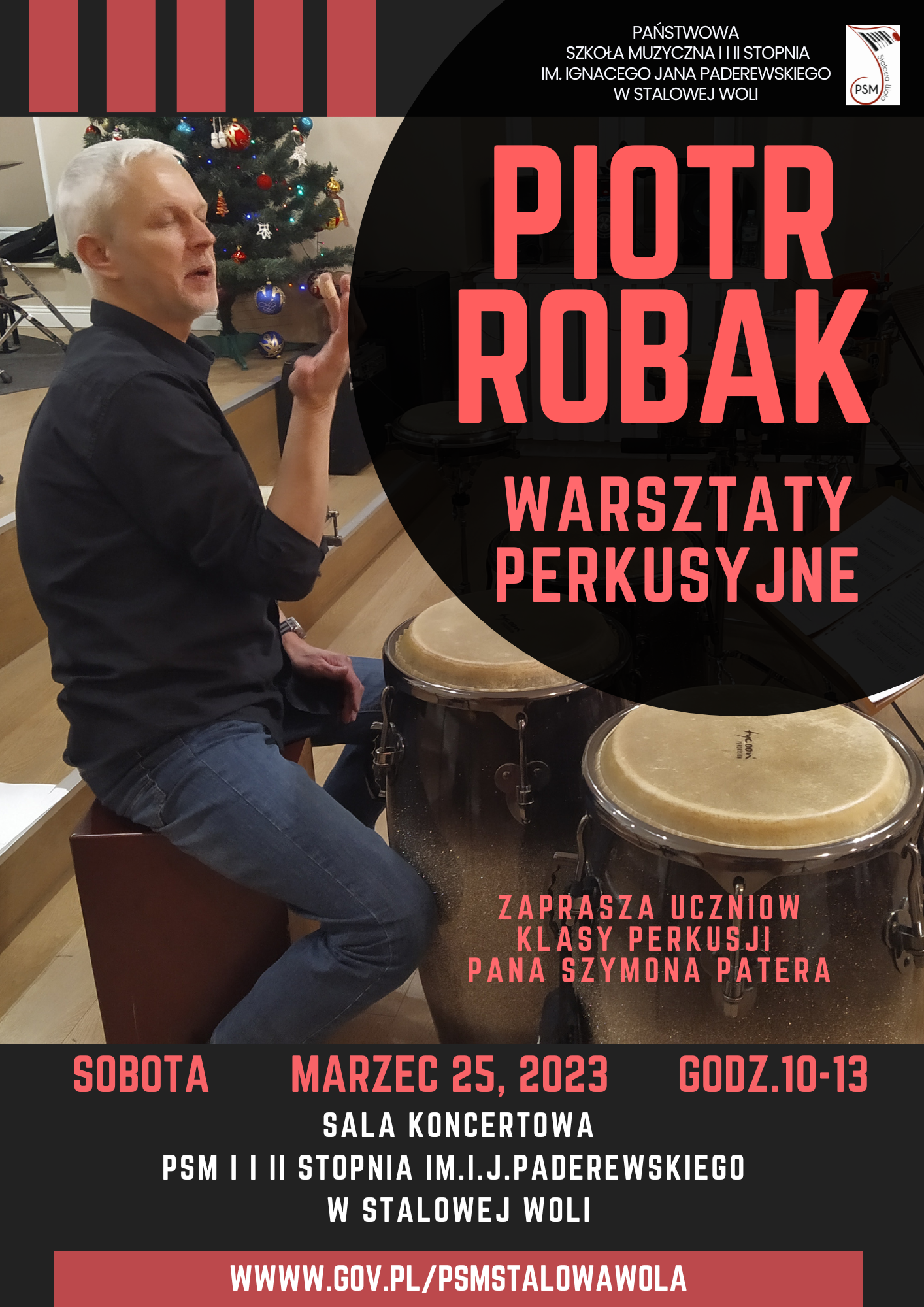 25 marca 2023 r. odbędą się Szkolne Warsztaty Perkusyjne prowadzone przez pana Piotra Robaka, który jest aktualnie perkusistą Filharmonii Świętokrzyskiej i wykładowcą w Zespole Państwowych Szkół Muzycznych im. Ludomira Różyckiego w Kielcach. W warsztatach wezmą udział tylko uczniowie naszej klasy perkusji.
