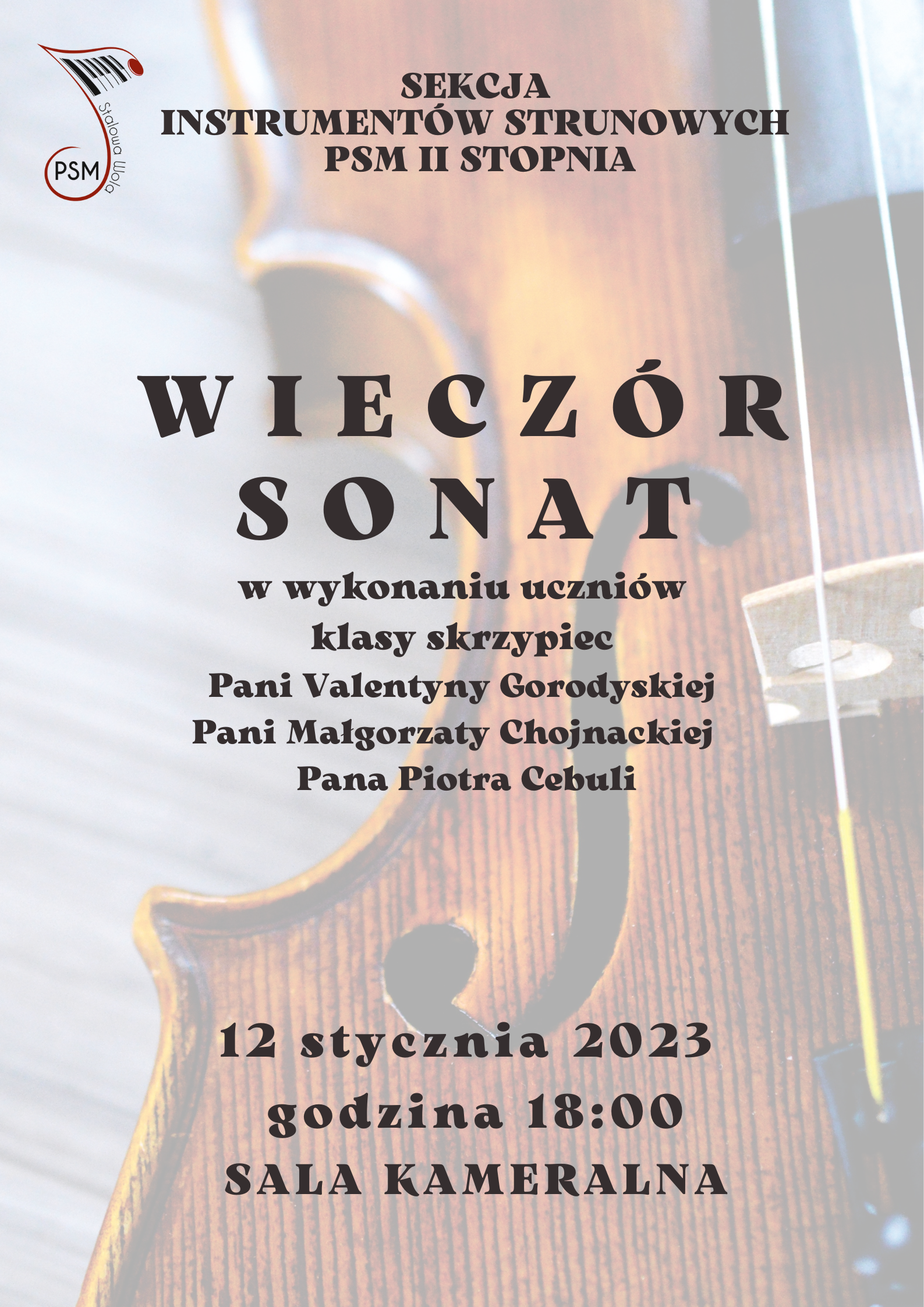 Serdecznie zapraszamy na Wieczór sonat w wykoanniu uczniów klasy skrzypiec PSM II stopnia.
