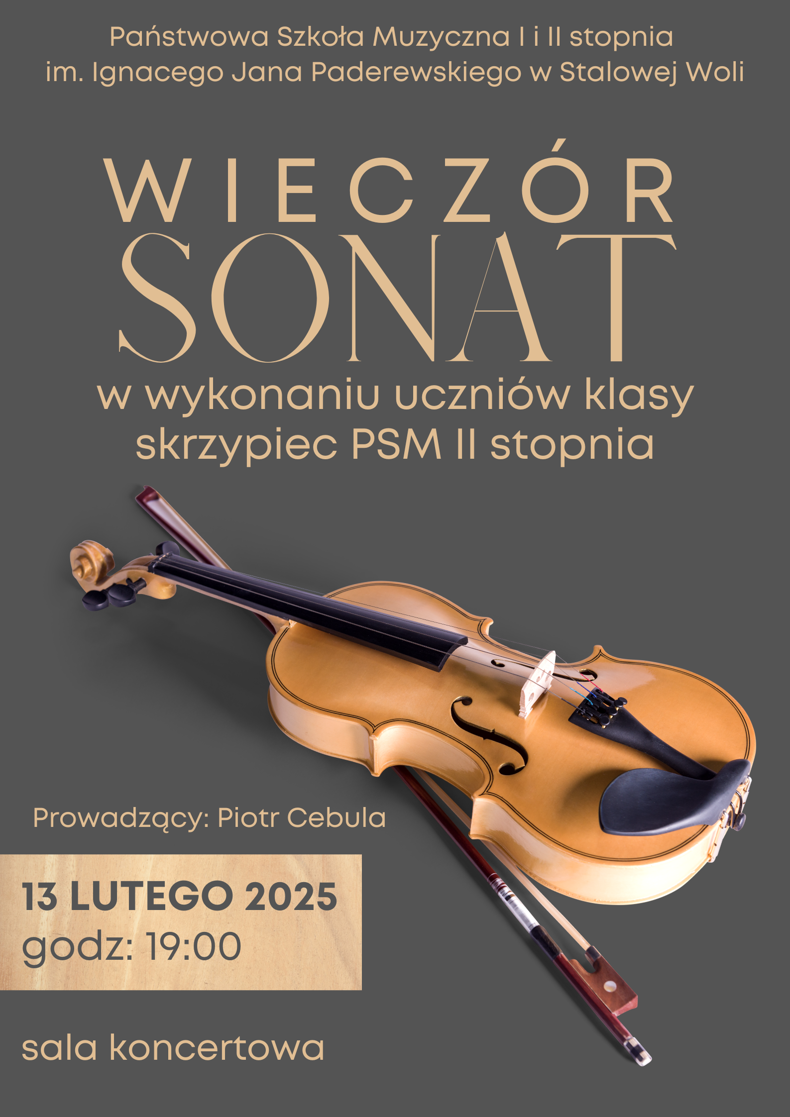 Państwowa Szkoła Muzyczna I i II stopnia im. Ignacego Jana Paderewskiego w Stalowej Woli zaprasza na wyjątkowy Wieczór Sonat, podczas którego uczniowie klasy skrzypiec PSM II stopnia zaprezentują swoje umiejętności.