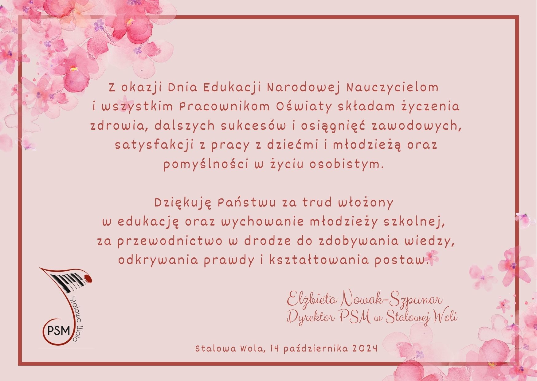Życzenia z okazji Dnia Edukacji Narodowej 14 października 2024 10.10.2024 Zdjęcia (1) Pokaż zdjęcie 1 z galerii.