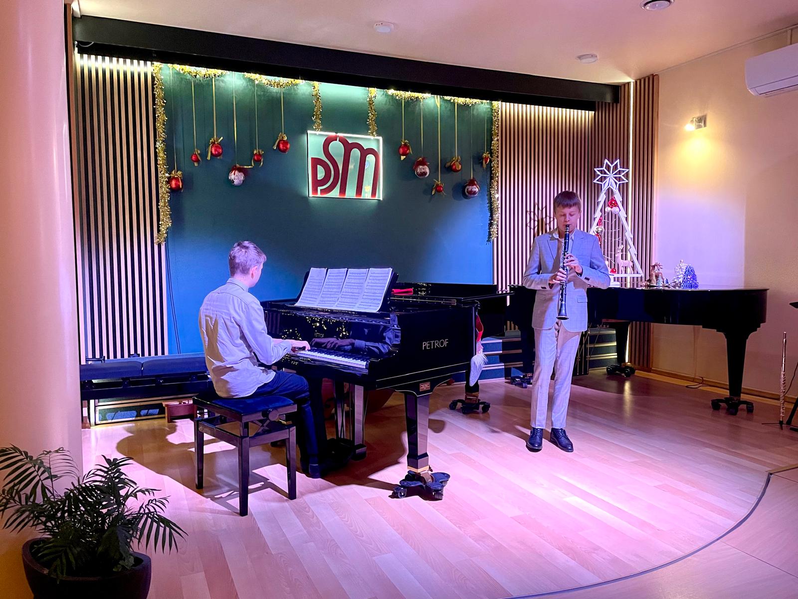 Uczniowie, zarówno solowo, jak i w duecie, zaprezentowali się z najlepszej strony. Każdy występ był pełen emocji i zaangażowania, co świadczy o ciężkiej pracy i poświęceniu, jakie włożyli w przygotowania. Publiczność nagrodziła młodych artystów gromkimi brawami, doceniając ich talent i wysiłek. Uczniowie najstarszej klasy - Oliwier i Antosia - zagrali utwór na cztery ręce. Gościnnie wystąpił Filip Bidziński z klasy klarnetu pana Marcina Trzebińskiego - brawo i dziękujemy! Oraz miła niespodzianka: rodzice Antosi razem z córką wykonali utwór na flet, kontrabas, i fortepian.