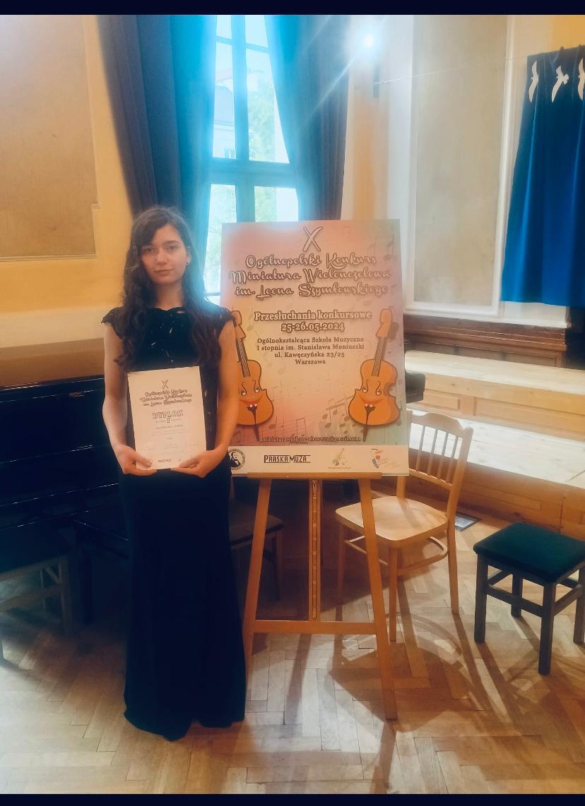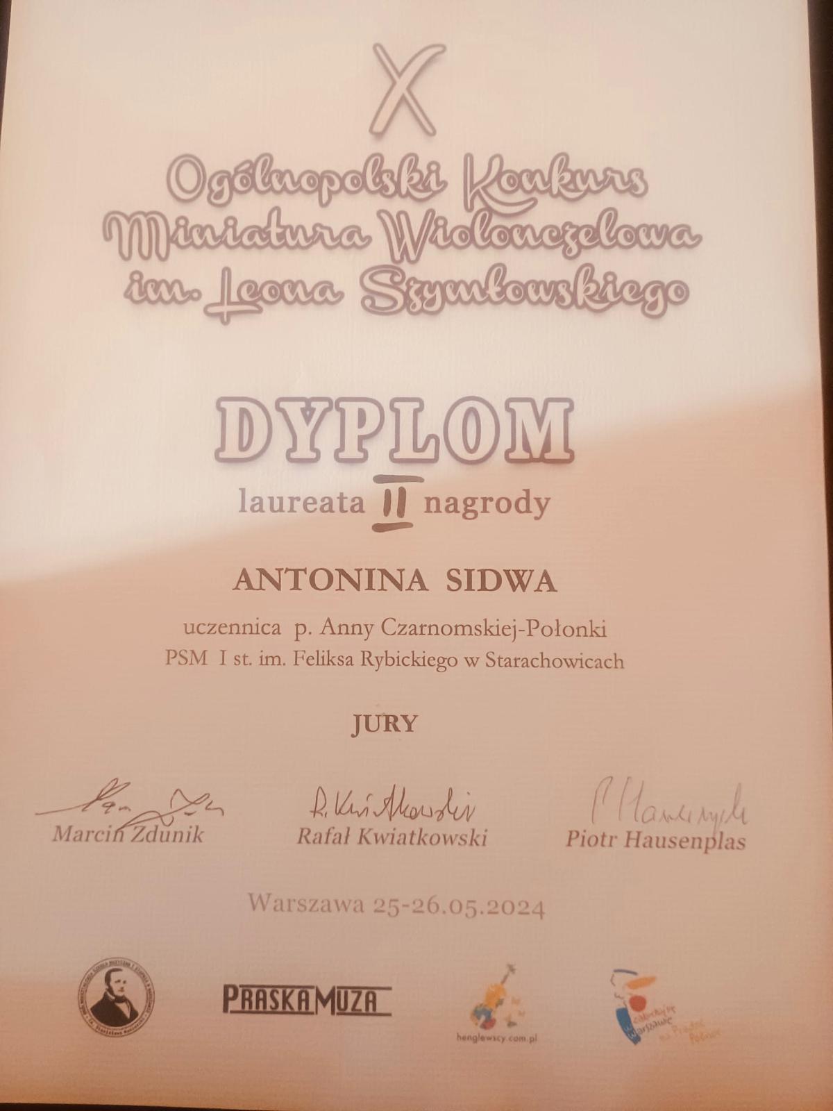 25 maja Antosia Sidwa, wiolonczelistka, została laureatką II NAGRODY na X Ogólnopolskim Konkursie „Miniatura wiolonczelowa” im. Leona Szymłowskiego w Warszawie!!!