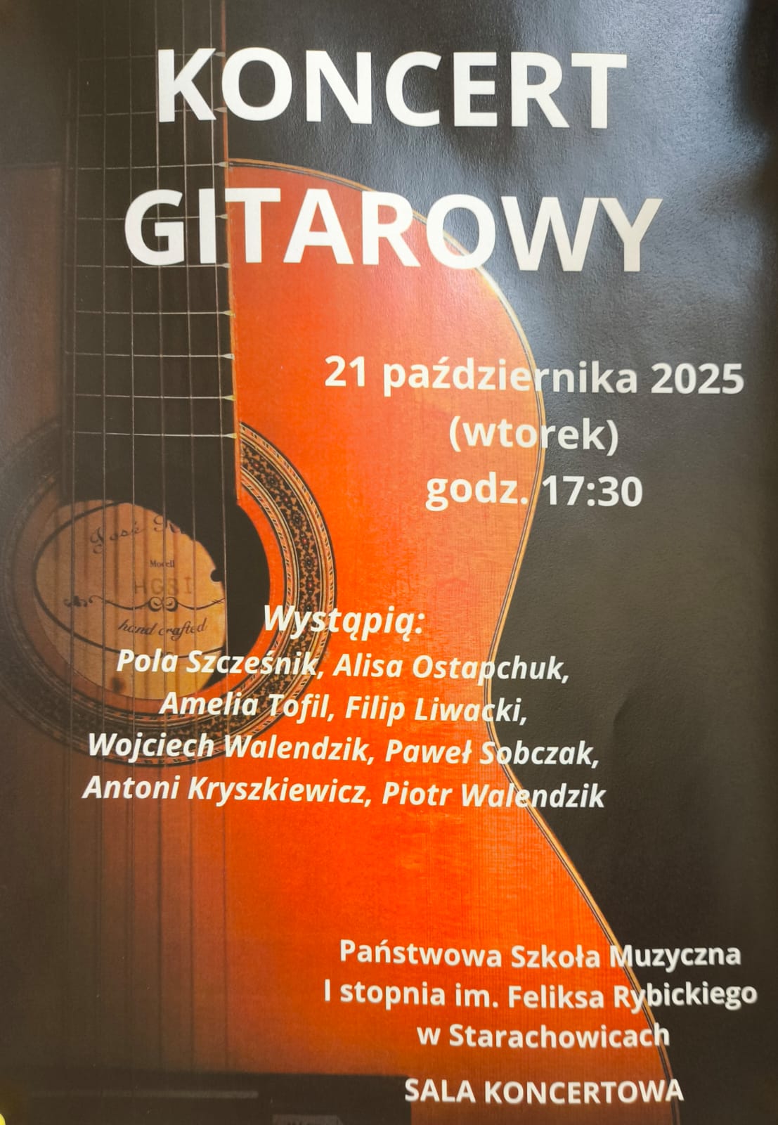 21 października, w murach Państwowej Szkoły Muzycznej im. Feliksa Rybickiego w Starachowicach odbył się wyjątkowy Koncert Gitarowy, który zgromadził melomanów i miłośników muzyki w każdym wieku. Wydarzenie, które rozpoczęło się o godzinie 17:30, na długo pozostanie w pamięci wszystkich obecnych. Chcielibyśmy gorąco podziękować wszystkim uczestnikom koncertu za przybycie i wspólne celebrowanie muzyki. Wasza obecność i entuzjazm stworzyły wyjątkową atmosferę, która towarzyszyła nam przez całe wydarzenie. To dzięki Wam, mogliśmy poczuć prawdziwą magię sceny i dzielić się swoją sztuką z pełnym oddaniem. Gratulcja dla młodych artystów: Poli Szcześnik, Alisy Ostapchuk, Amelii Tofil, Filipa Liwackiego, Wojciecha Walendzika, Pawła Sobczaka, Antoniego Kryszkiewicza i Piotra Walendzika, oraz niezastąpionych nauczycieli którzy to wydarzenie przygotowali - Dariusza Wróbla oraz Magdaleny Pałgan-Wróbel.