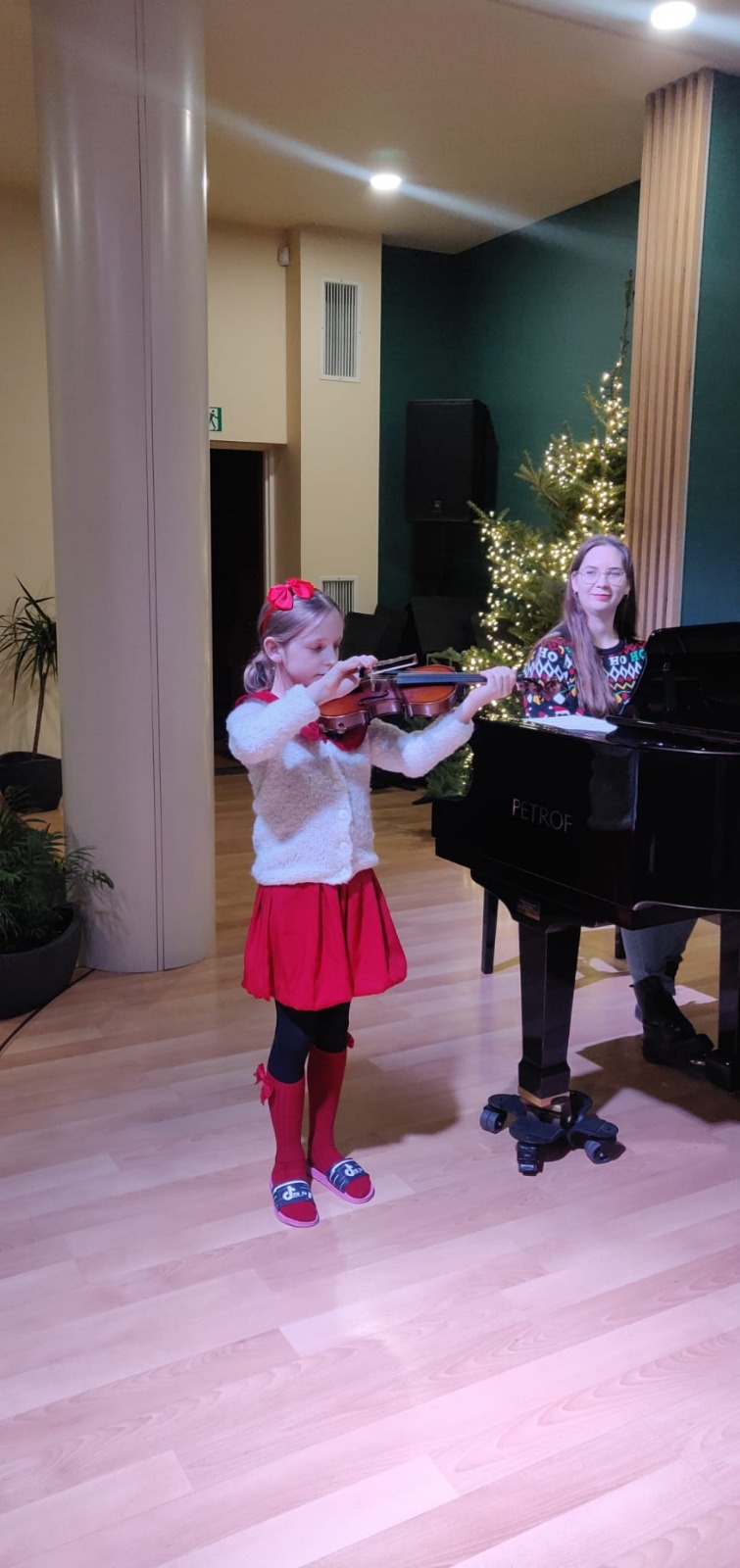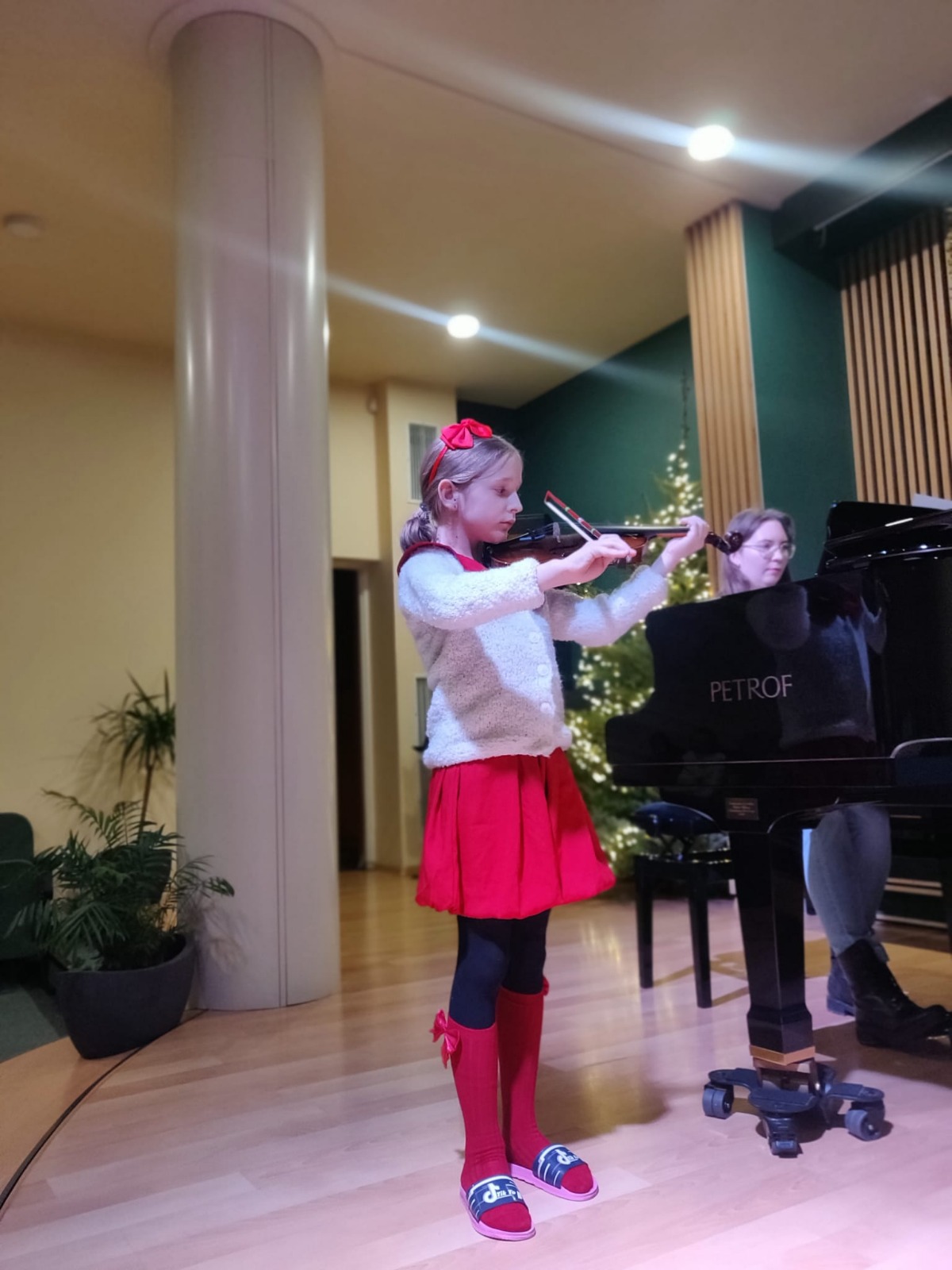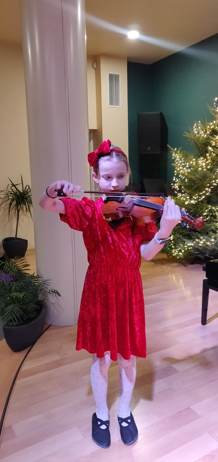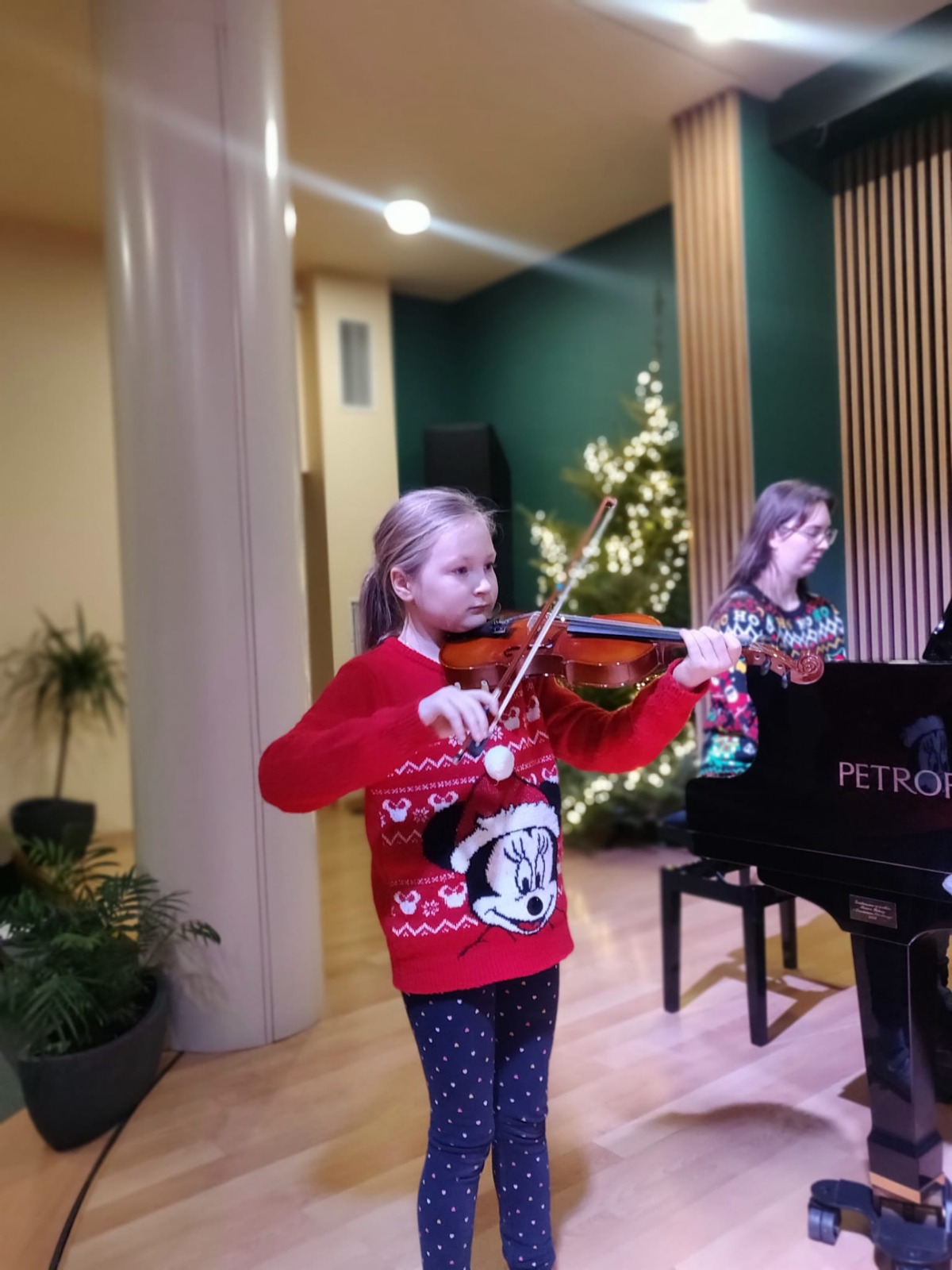 Młodzi skrzypkowie zachwycili publiczność swoimi występami, grając znane melodie i wprowadzając wszystkich w świąteczny nastrój. Każdy uczeń wykazywał się nie tylko precyzją i techniką, ale także radością płynącą z grania.