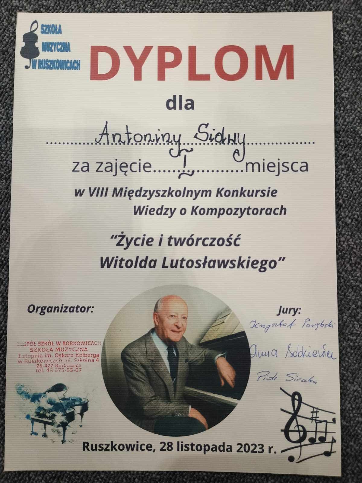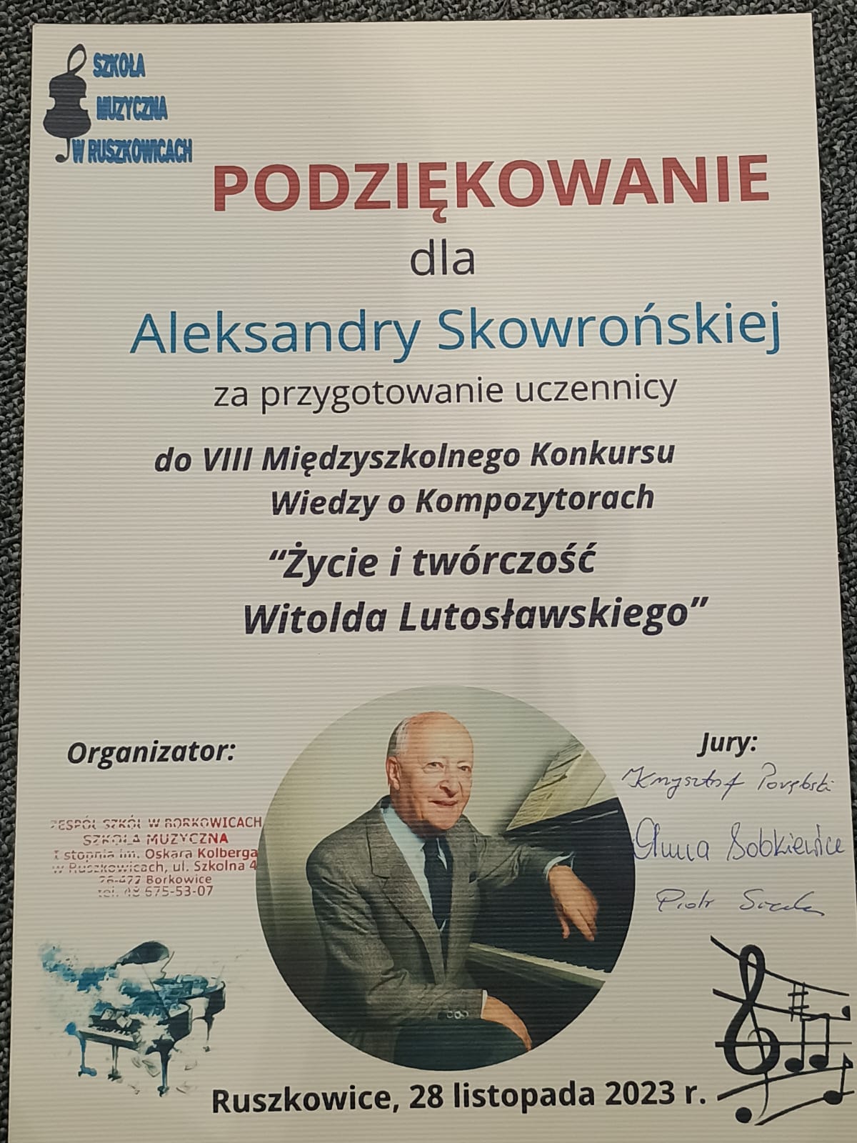 Sukces !!! Antonina Sidwa zajęła I miejsce w VIII Międzyszkolny Konkursie Wiedzy o Kompozytorach, który odbył się 28 listopada 2023 r. w Szkole Muzycznej w Ruszkowicach! Ogromne gratulacje dla Antoniny i p. Aleksandry Skowrońskiej, która Antoninę przygotowała.