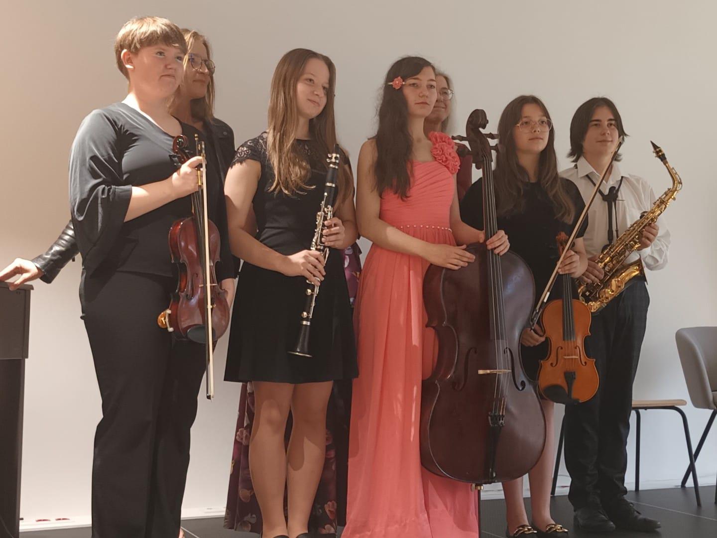 14.06 odbył się koncert uczniów i nauczycieli Państwowej Szkoły Muzycznej w Centrum Kreatywności Pałacyk. Wystąpili uczniowie: Magdalena Sala - skrzypce, Katarzyna Bies - skrzypce, Jakub Malinowski - saksofon, Gabriela Tokarska - klarnet i Antonina Sidwa - wiolonczela oraz nauczyciele: Luiza Zegadło - Kołda - flet poprzeczny i Elżbieta Kulińska - fortepian, akompaniament. Koncert prowadziła p. Luiza Zegadło - Kołda. Dziękujemy zebranej publiczności za tak liczne przybycie i wielkie brawa dla wykonawców. Dziękujemy p. dyrektor Aleksandrze Skowrońskiej i dyrektorowi Centrum Kreatywności Pałacyk p. Iwonie Tamiołło za wspaniały pomysł, opiekę, ciepłe przyjęcie i możliwość zagrania w Pałacyku. Mamy nadzieję, że ten pierwszy koncert zaowocuje kolejnymi w niedalekiej przyszłości. Gratulacje dla wszystkich wykonawców !!! To była prawdziwa muzyczna uczta!