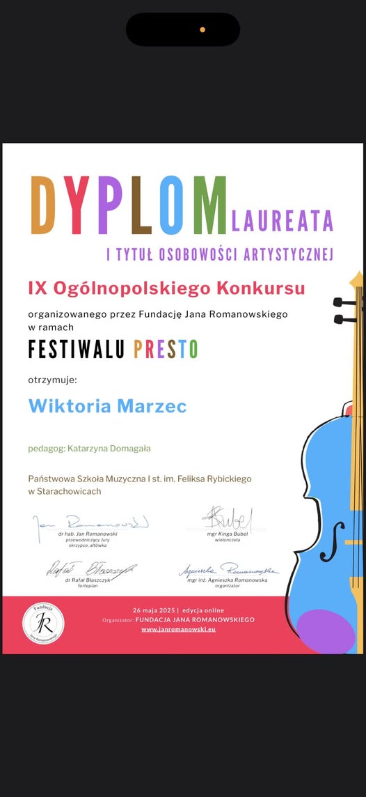 26 maja Wiktoria Marzec pianistka z klasy I cyklu sześcioletniego uczennica p. Katarzyny Domagały otrzymała DYPLOM LAUREATA oraz TYTUŁ OSOBOWOŚCI ARTYSTYCZNEJ na IX OGÓLNOPOLSKIM KONKURSIE PRESTO.