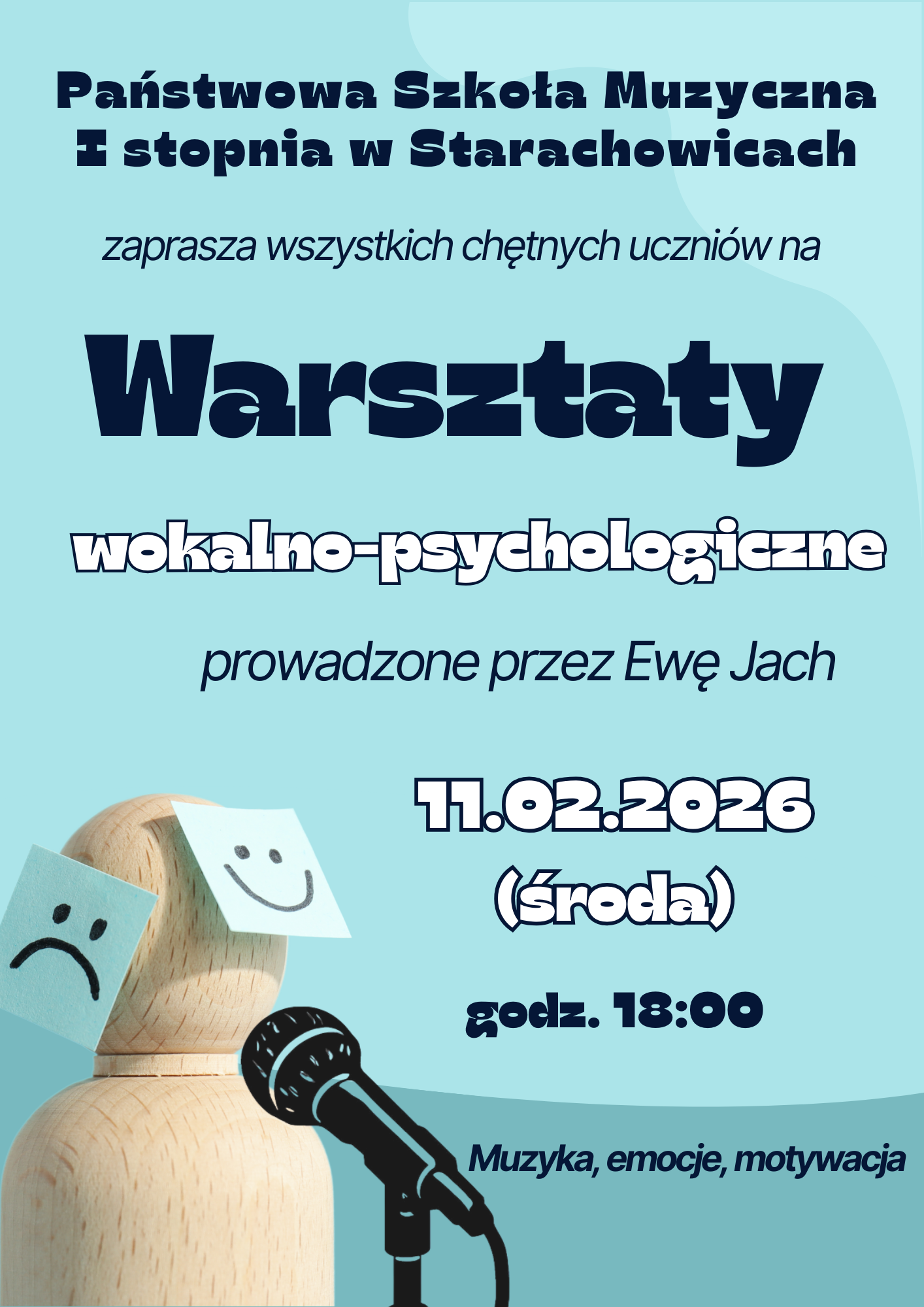 W dniu 11 lutego 2026 roku (środa) o godzinie 18:00, w Państwowej Szkole Muzycznej I Stopnia w Starachowicach, odbyły się wyjątkowe warsztaty wokalno-psychologiczne, prowadzone przez Ewę Jach. Wydarzenie to było okazją dla wszystkich chętnych uczniów, aby zgłębić tajniki łączące muzykę z emocjami i motywacją.