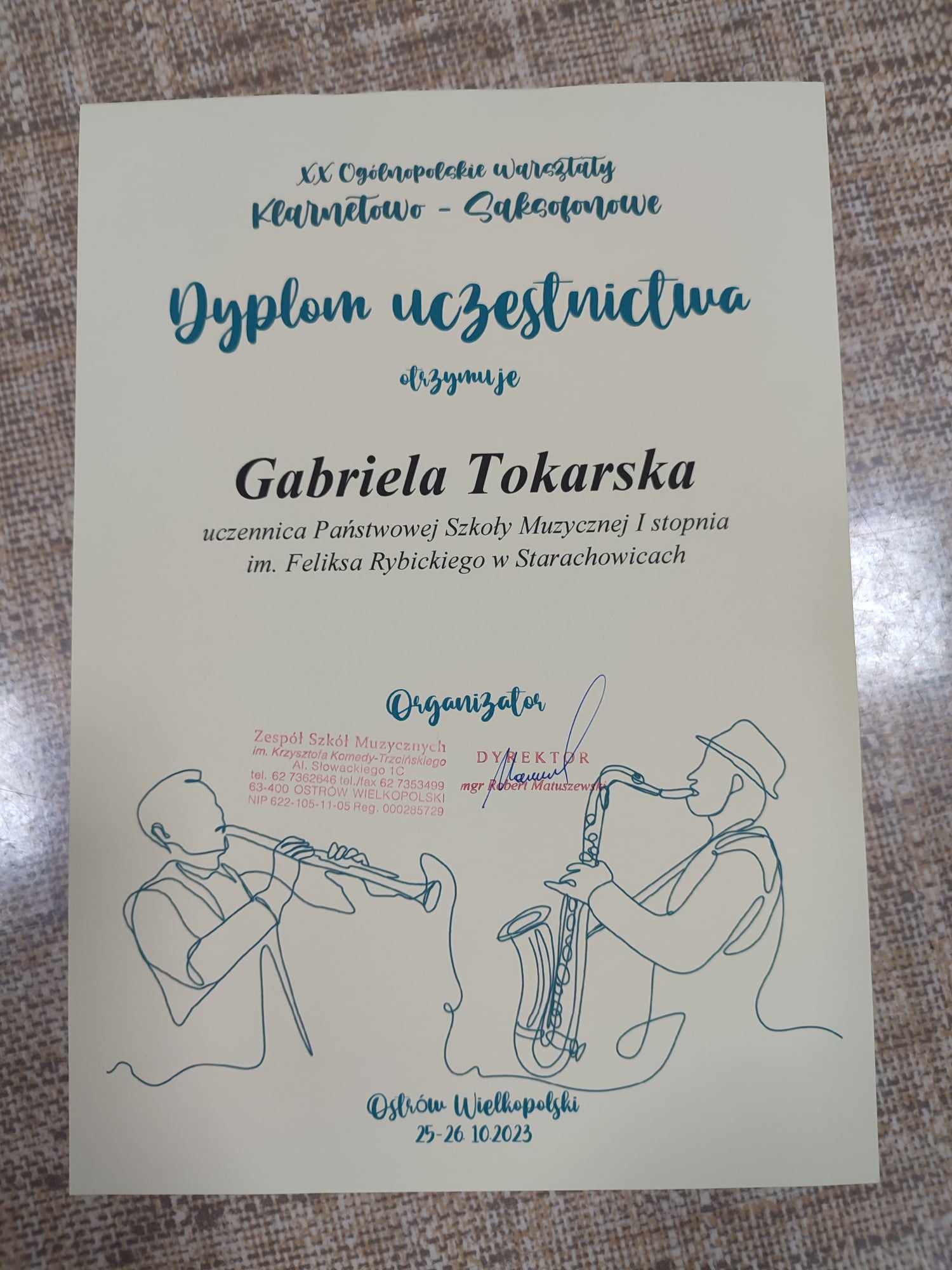 W dniach 25-26 października 2023 roku odbyły się warsztaty klarnetowo saksofonowe w Ostrowie Wielkopolskim na których reprezentowała naszą szkołę uczennica Gabriela Tokarska którą przygotował pan Marcin Trzebiński nauczyciel naszej szkoły. Warsztaty prowadzili (m. in. p. Dorota Żołnacz, p. Paweł Kroczek, p. Piotr Lato) wybitni pedagodzy i profesorowie akademii muzycznych z Krakowa i Poznania. Gratulujemy i życzymy kolejnych sukcesów.