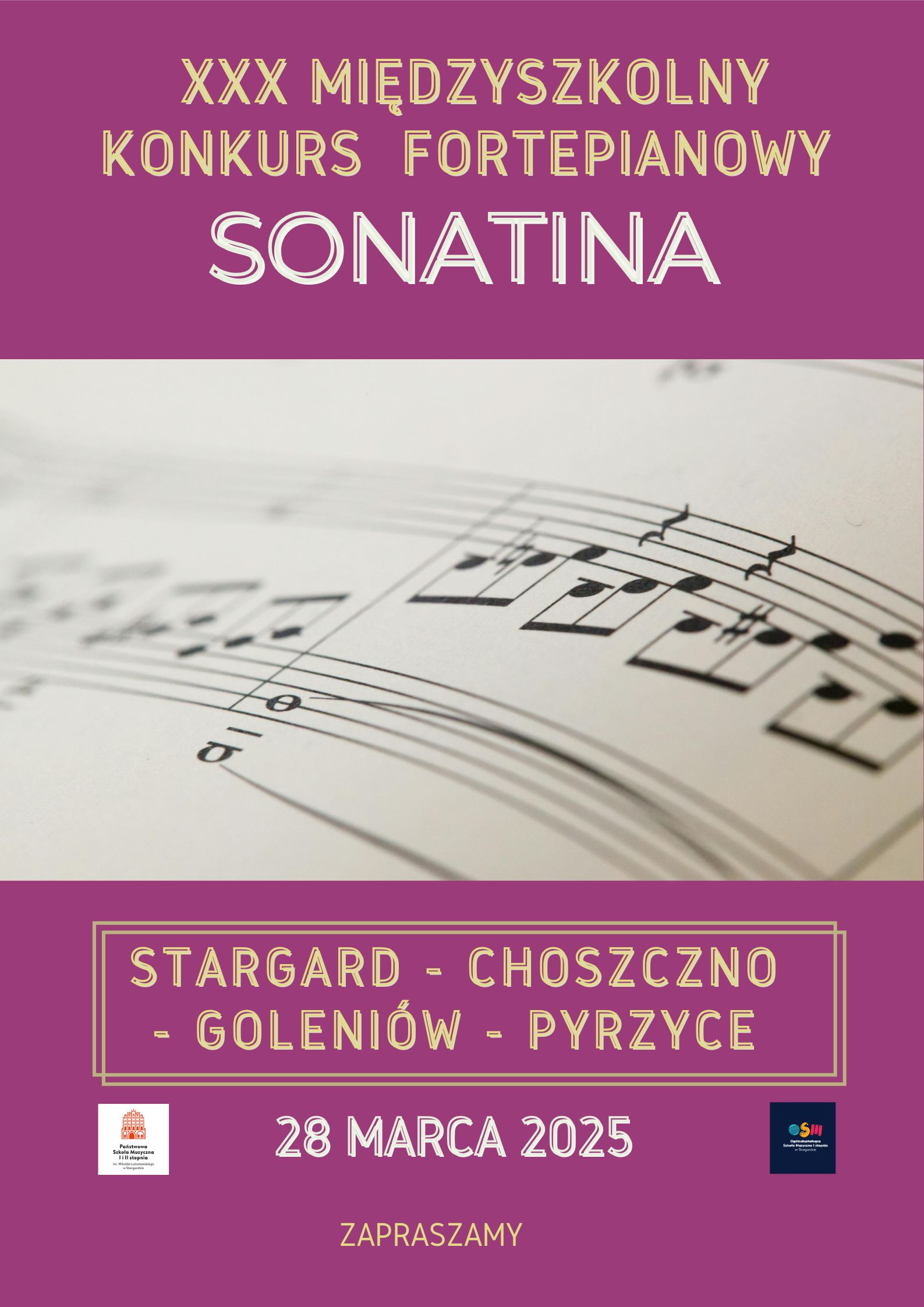 W dniu 28 marca 2025 r. nasza szkoła wraz z Ogólnokształcącą Szkołą Muzyczną I stopnia w Stargardzie będzie gospodarzem 30. Międzyszkolnego Konkursu Fortepianowego „Sonatina”. W konkursie wezmą udział uczniowie szkół muzycznych z Choszczna, Goleniowa, Pyrzyc i Stargardu.