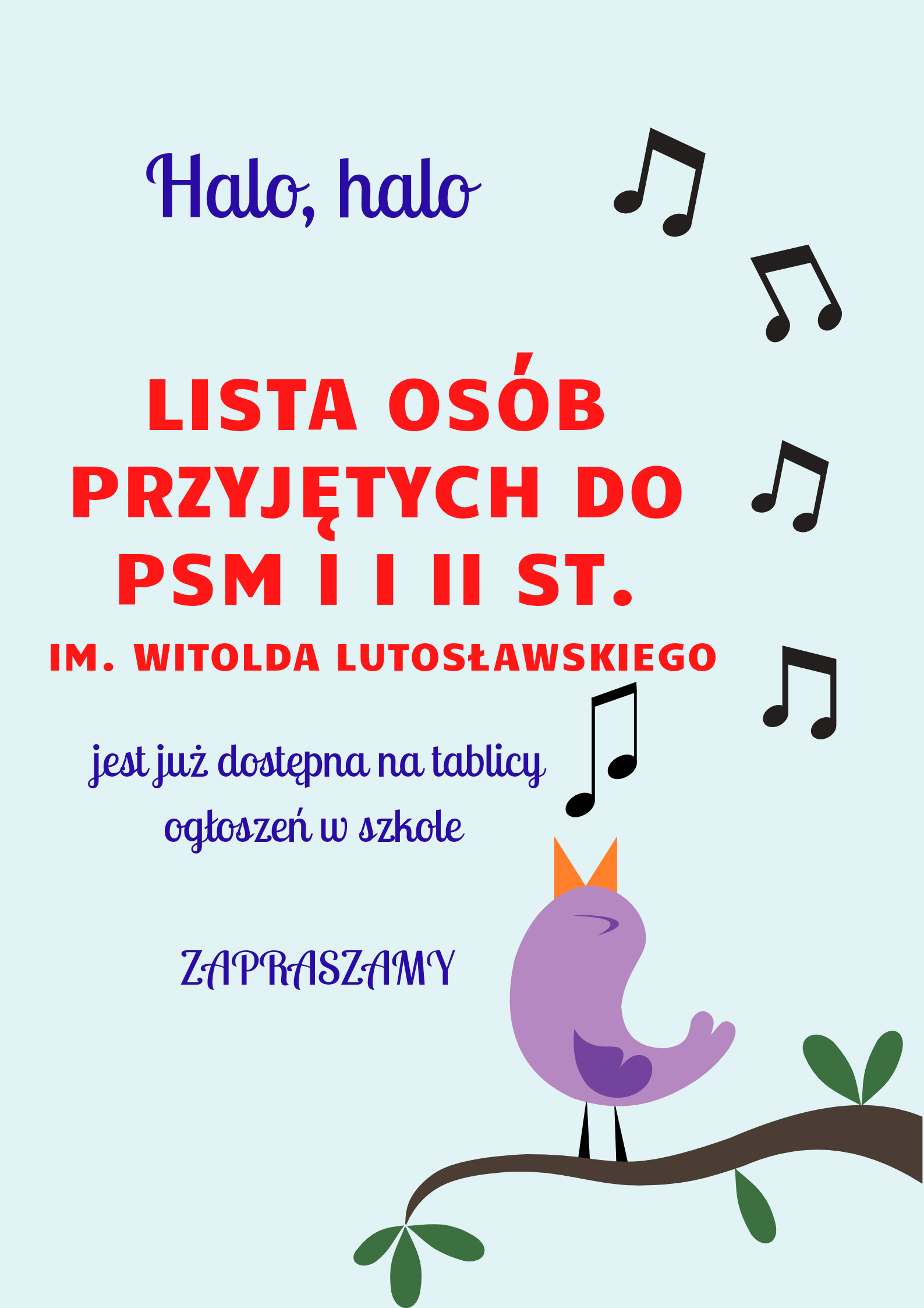 Lista osób przyjętych w wyniku rekrutacji do PSM I i II st. 21.06.2023 Jest już dostępna na tablicy ogłoszeń w szkole.