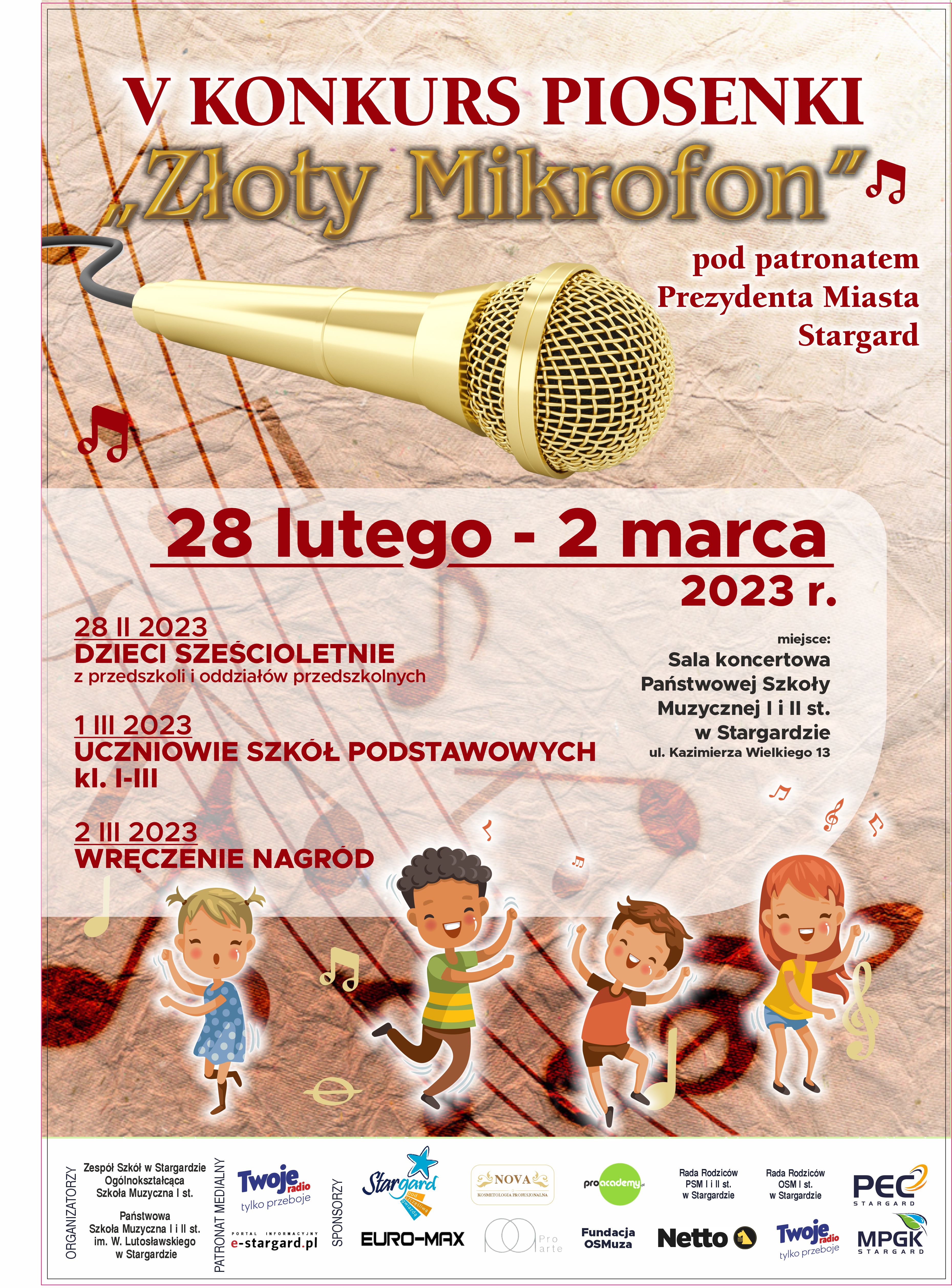 W dniach od 28 lutego do 2 marca 2023 zapraszamy na przesłuchania V edycji Konkursu Piosenki "Złoty Mikrofon" pod patronatem Prezydenta Miasta Stargard