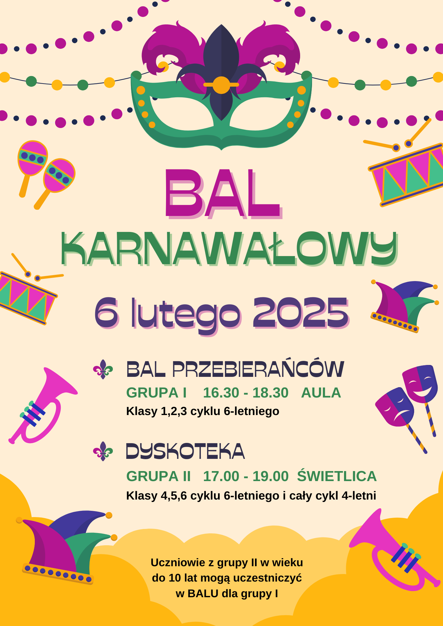 Drodzy uczniowie jak co roku przygotowaliśmy dla was moc atrakcji, podczas szkolnego balu karnawałowego.