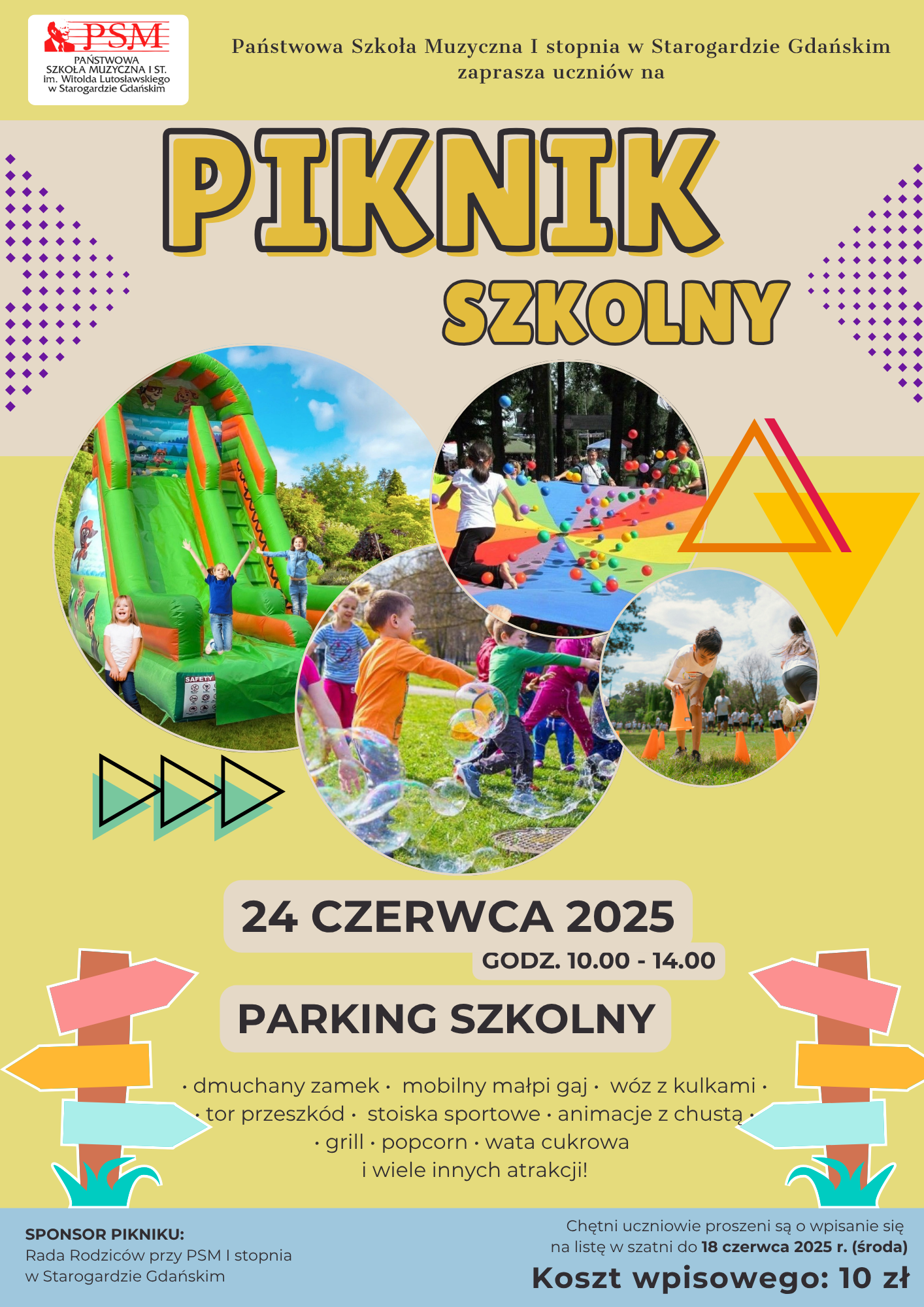 Baner z napisem piknik szkolny w kolorze czarno żółtym, po lewej stronie kolorowe drogowskazy, tło żółto-beżowe. Po prawej fioletowa grafika strzałki.