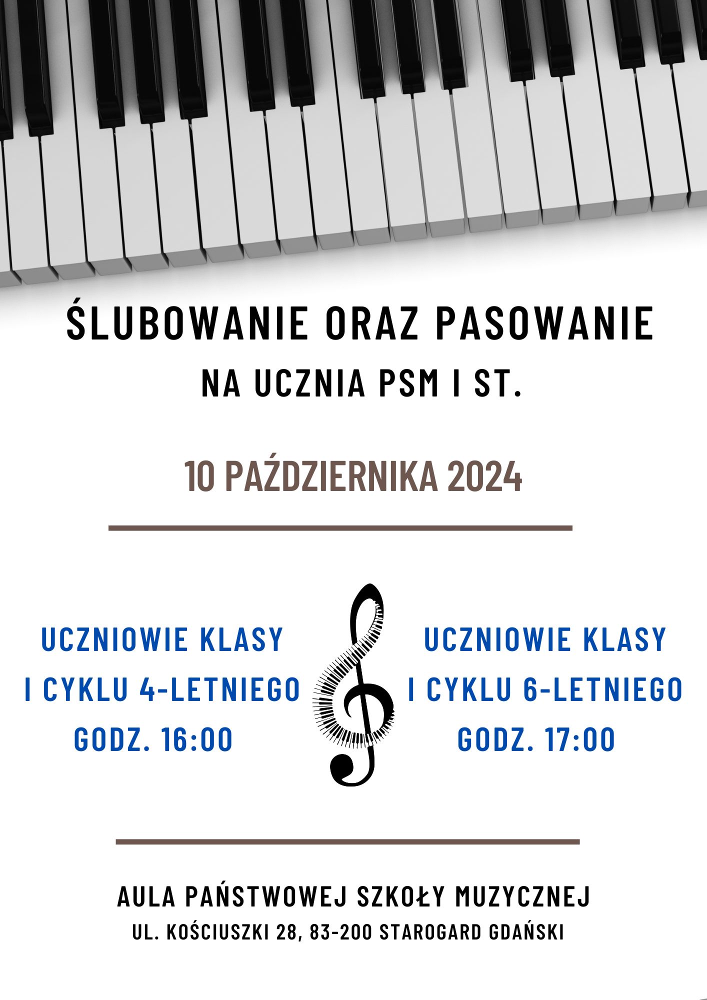Plakat z białym tłem i czarną czcionką z umieszczoną u góry klawiaturą pianina. Pod grafiką klawiatury znajdują się informacje dotyczące ślubowania oraz pasowania na ucznia PSM I st.