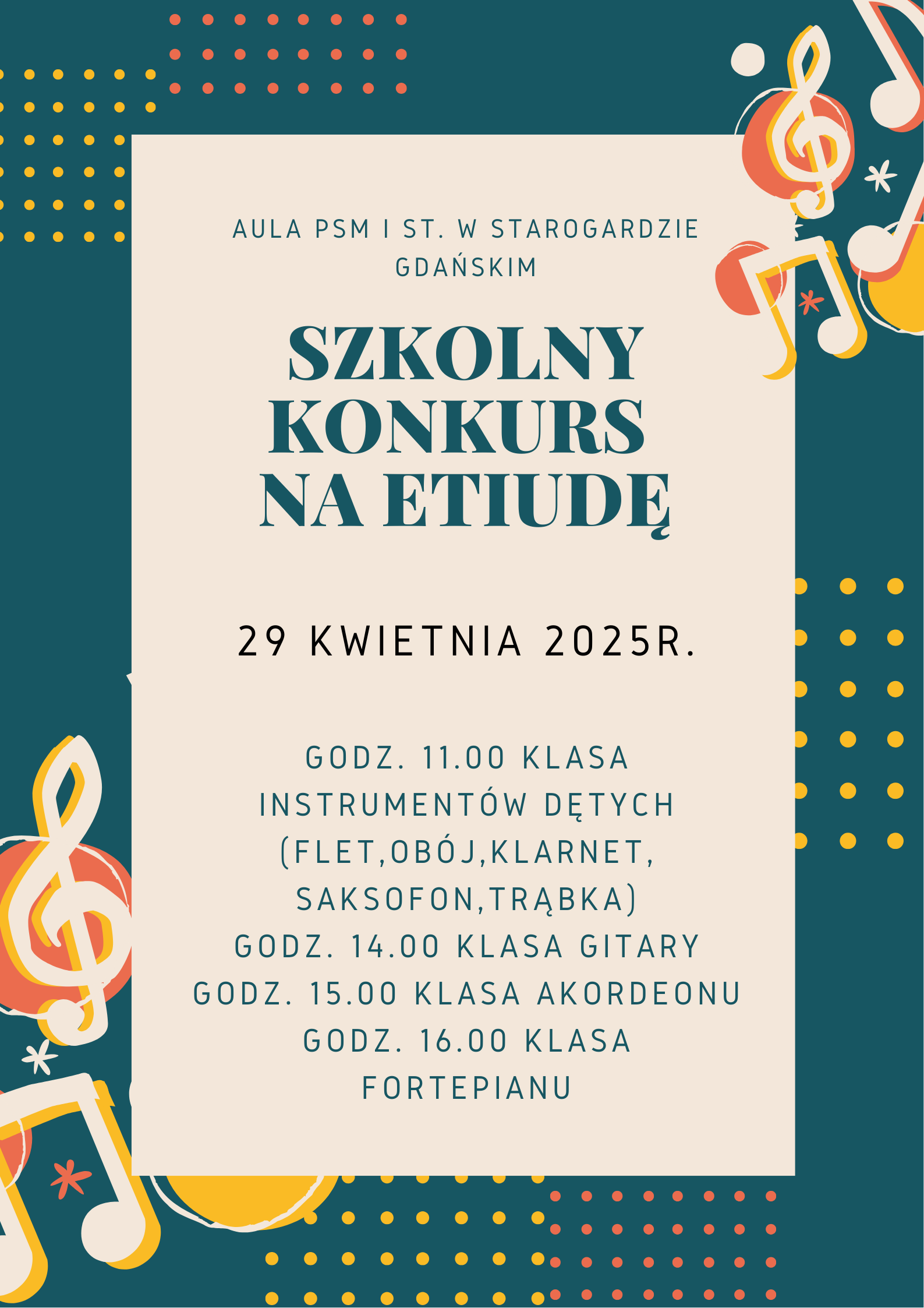 Pllakat informacyjny szkolny konkurs na etiudę. Oprawa plakatu w kolorze zielonej ramki, na ramce kolorowe nutki. Na środku drukowane duże litery SZKOLNY KONKURS NA ETIUDĘ, Informacja o dacie konkursu 29 kwietnia 2025 roku na szkolnej auli.