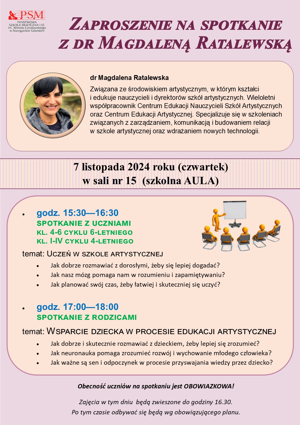 Serdecznie zapraszamy na spotkanie z dr Magdaleną Ratalewską w dniu 7 listopada 2024r.