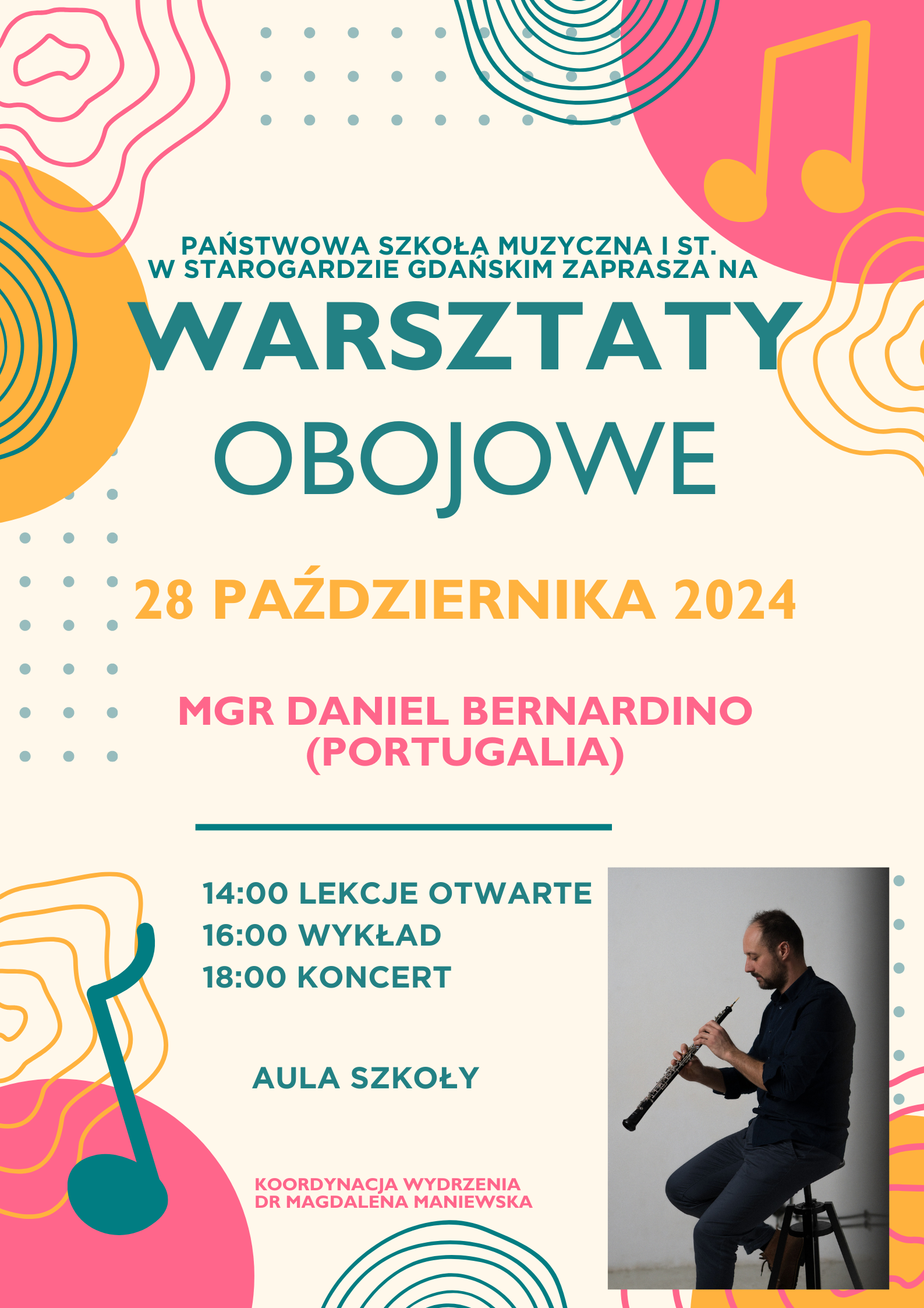 Plakat w jasnych barwach dotyczący organizowanych w szkole warsztatów obojowych w dniu 28 października 2024 roku w szkole. Na plakacie znajudją się kolorowe nuty, tło plakatu jest w odcieniu jasnego beżu. Na dole zapisano szczegółowe informacje tj. harmonogram warsztatów a także zdjęcie prowadzącego warsztaty, Na zdjęciu znajduje się mężczyzna, ubrany w czarne spodnie i swetr, siedzi na krześle spogąda na obój.