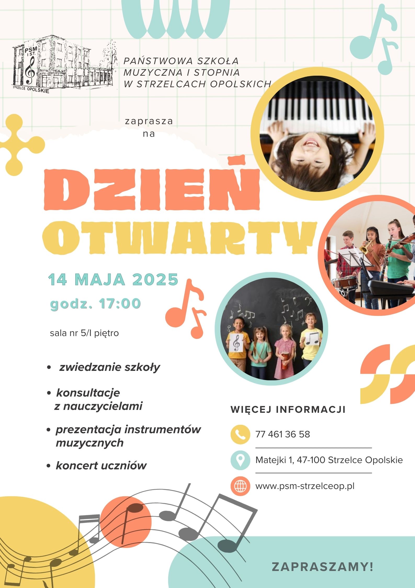 Zaproszenie na dzień otwarty szkoły, 14 maja 2025 godz. 17:00, grafika pastelowa, zdjęcia dzieci grających na instrumentach