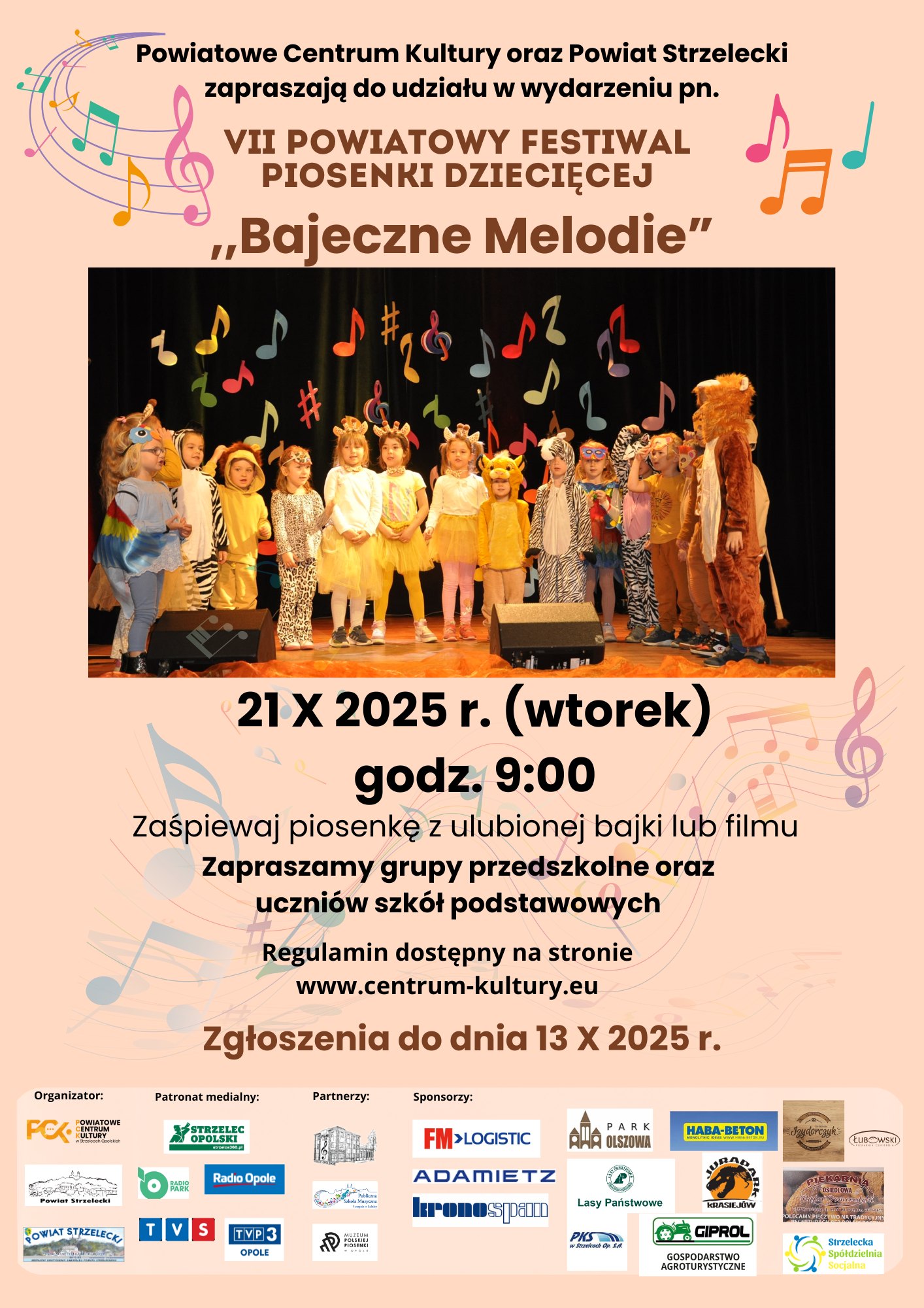 Powiatowe Centrum Kultury w Strzelcach Opolskich zaprasza na Festiwal Piosenki Dziecięcej „Bajeczne Melodie” 21 październik 2025 godz. 9:00 . Zgłoszenia do 13 października 2025.