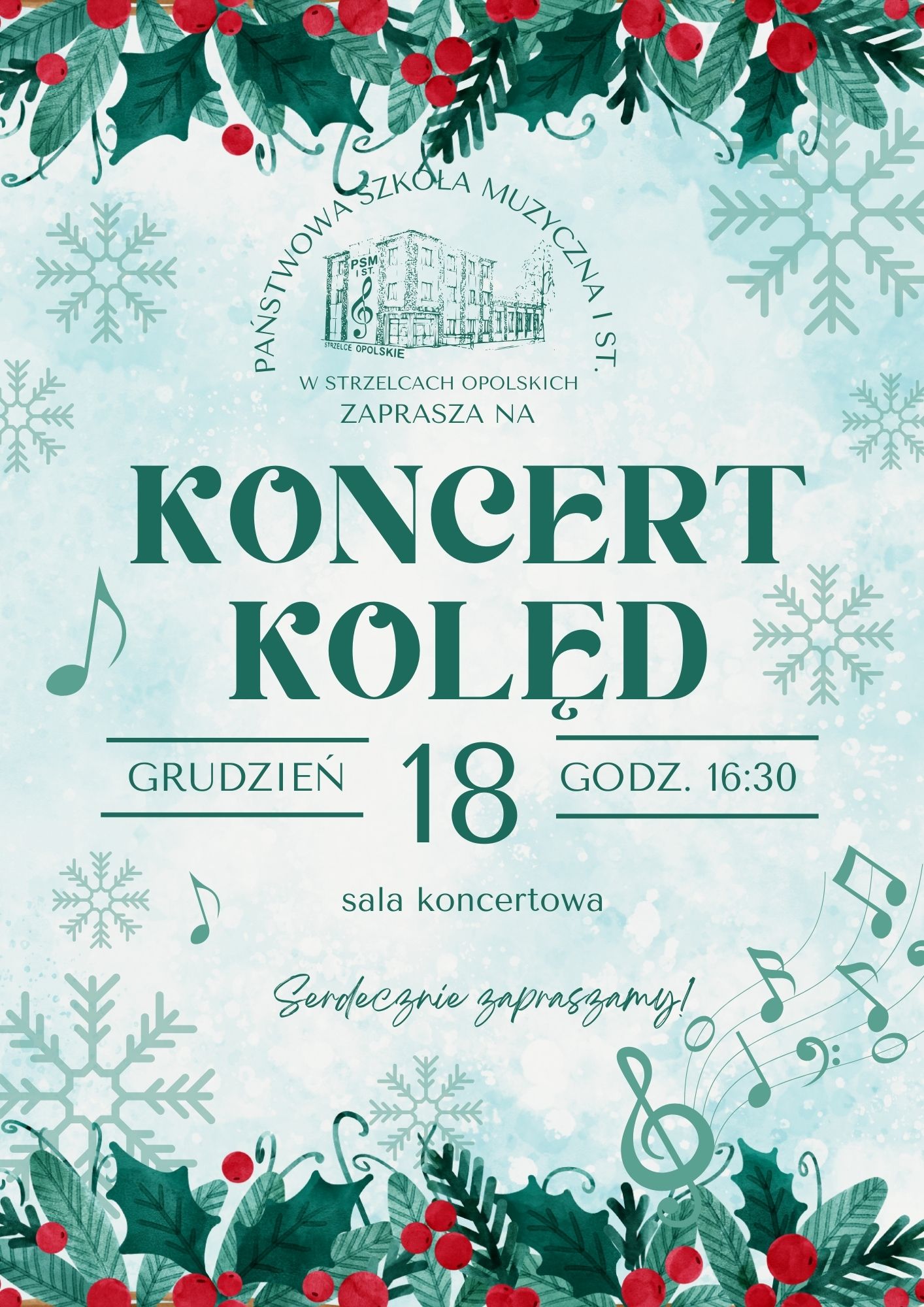 Zielona grafika, nutki, płatki śniegu w tle, zaproszenie na koncert kolęd 18 grudnia 2024 r. o godz. 16:30 w sali koncertowej