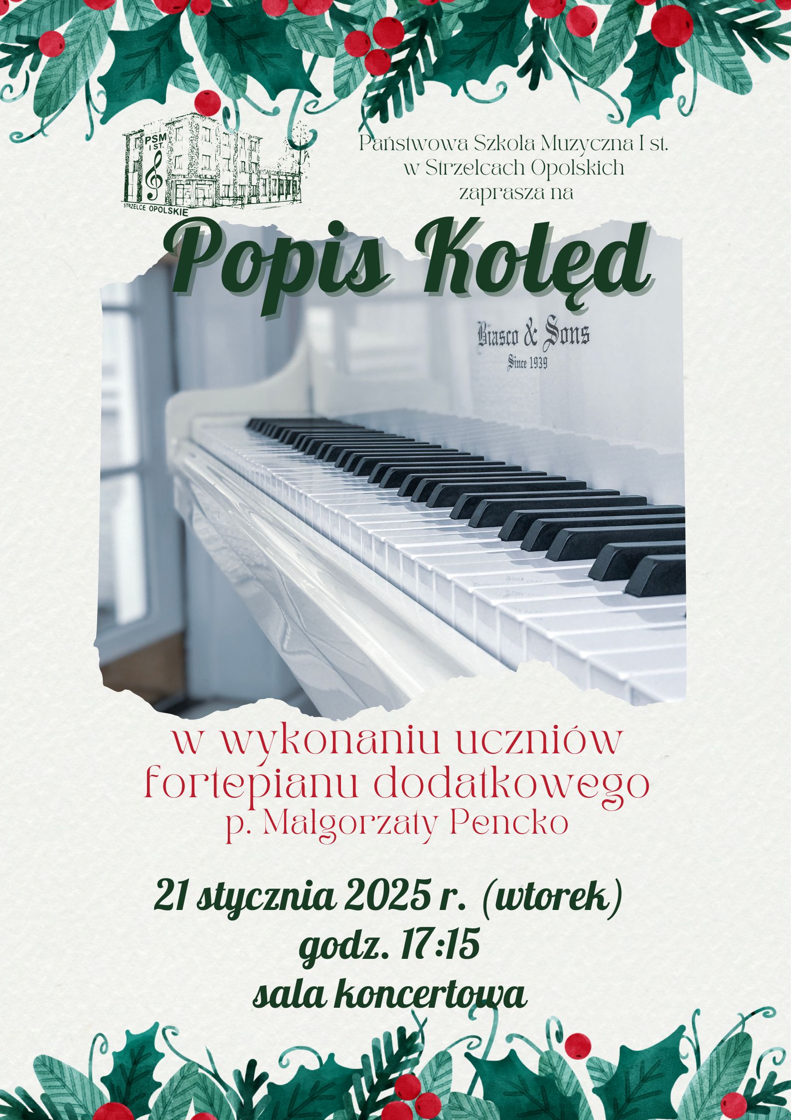 Koncert kolęd w wykonaniu uczniów fortepianu dodatkowego p. Małgorzaty Pencko, 21 stycznia godz. 17:15, zdjęcie fortepianu, logo szkoły.