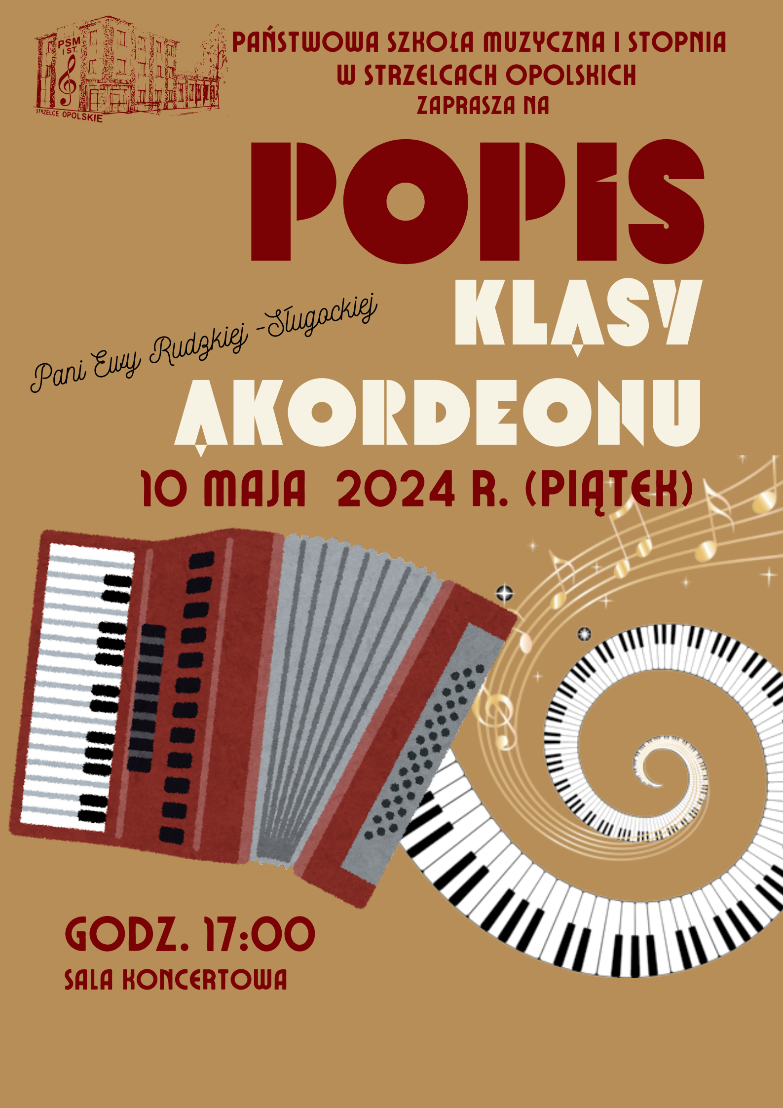 Plakat na brązowym tle, akordeon, klawisze, nutki zaproszenie na popis