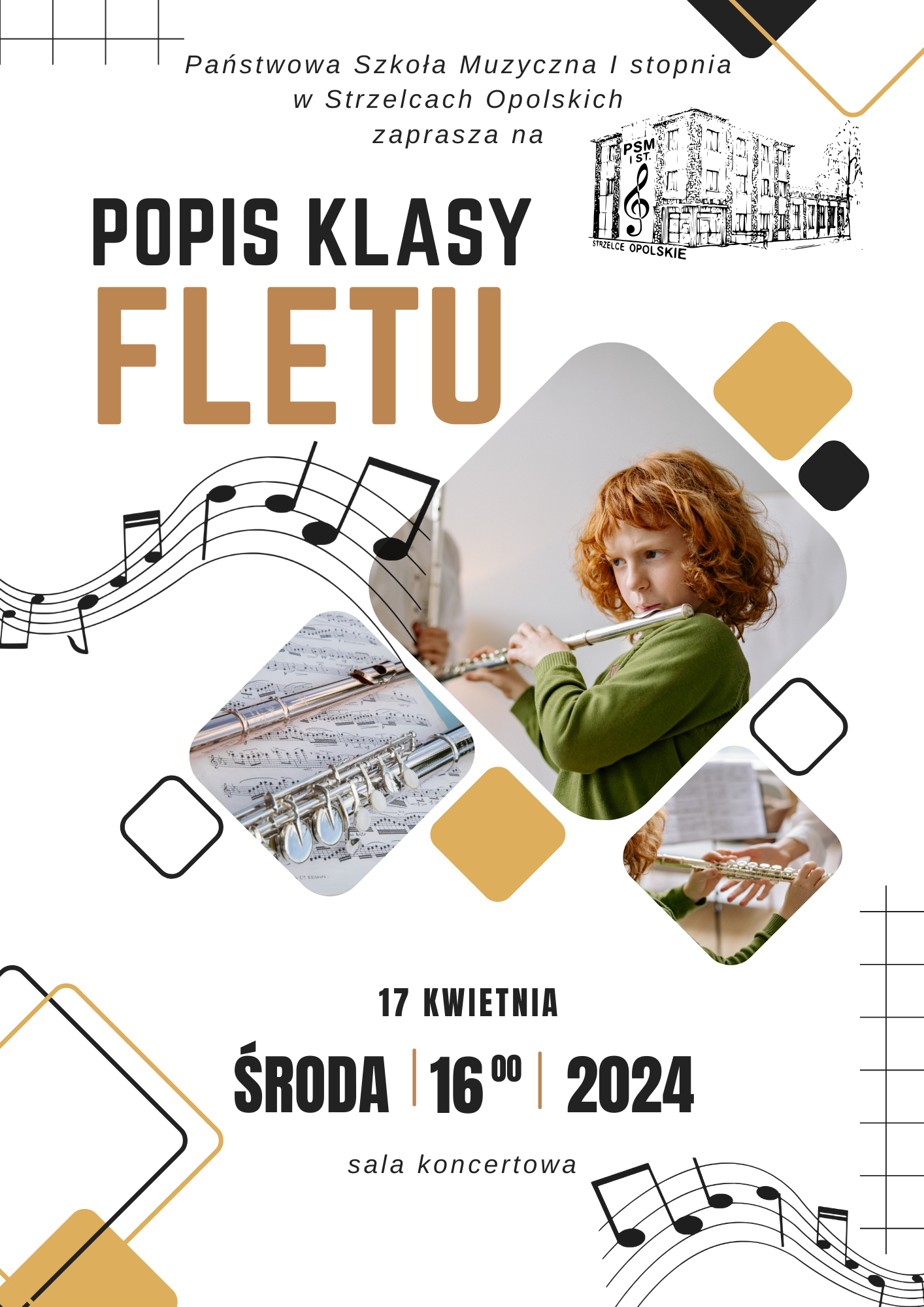 Białe tło, zdjęcia grającego na flecie chłopca, nuty, zaproszenie na popis klasy fletu 17 kwietnia środa, godz. 16.00