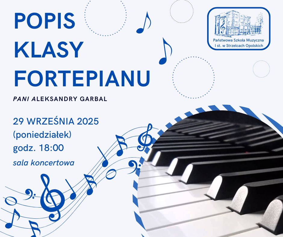 Popis klasy fortepianu A. Garbal 29 września 2025 o godz. 18:00 w sali koncertowej, grafika klawiatura pianina, logo szkoły w prawym górnym rogu