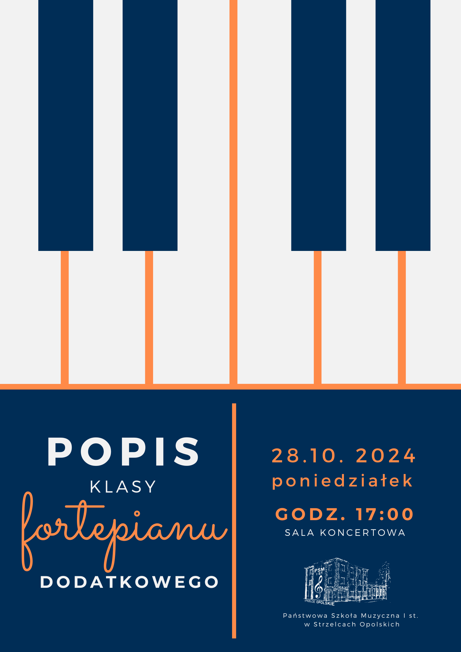 Granatowo białe tło, klawisze pianina, zaproszenie na popis klasy fortepianu dodatkowego 28 października o godz. 17.00 w sali koncertowej