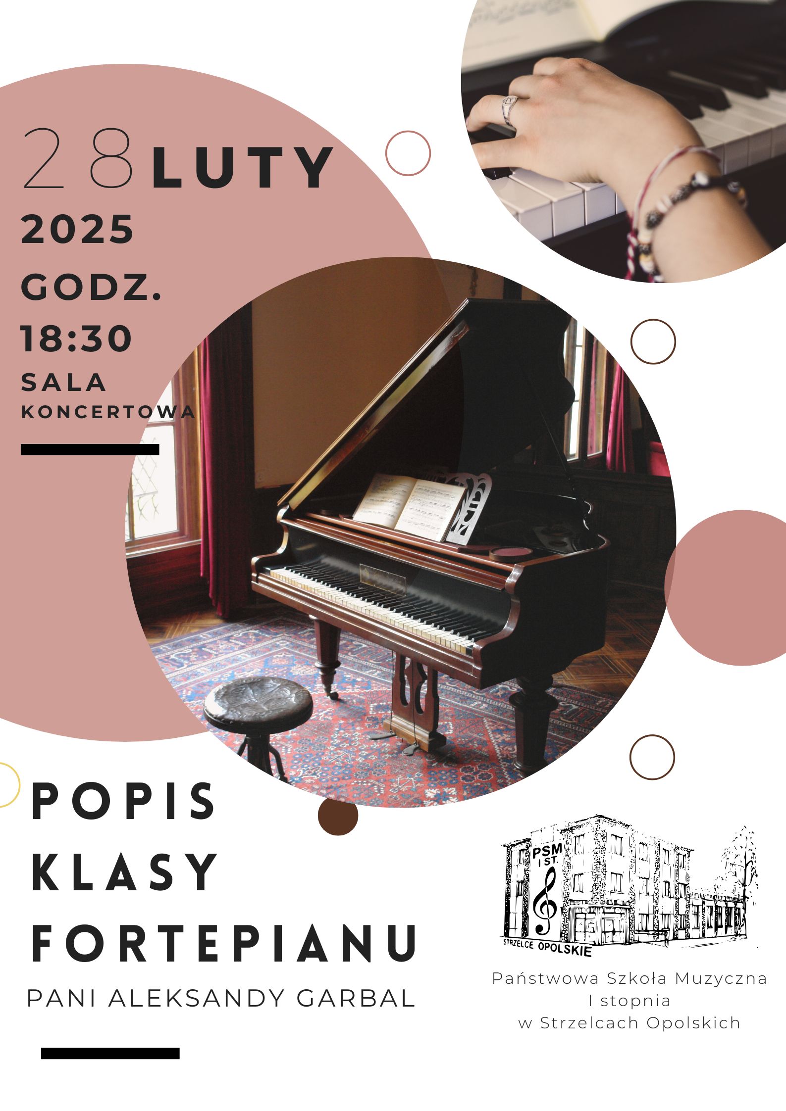 Zaproszenie na popis klasy fortepianu pani A. Garbal 28 luty 2025 godz. 18:30 sala koncertowa grafika: zdjęcia fortepianu oraz ręki na klawiszach, w dolnym prawym rogu logo szkoły
