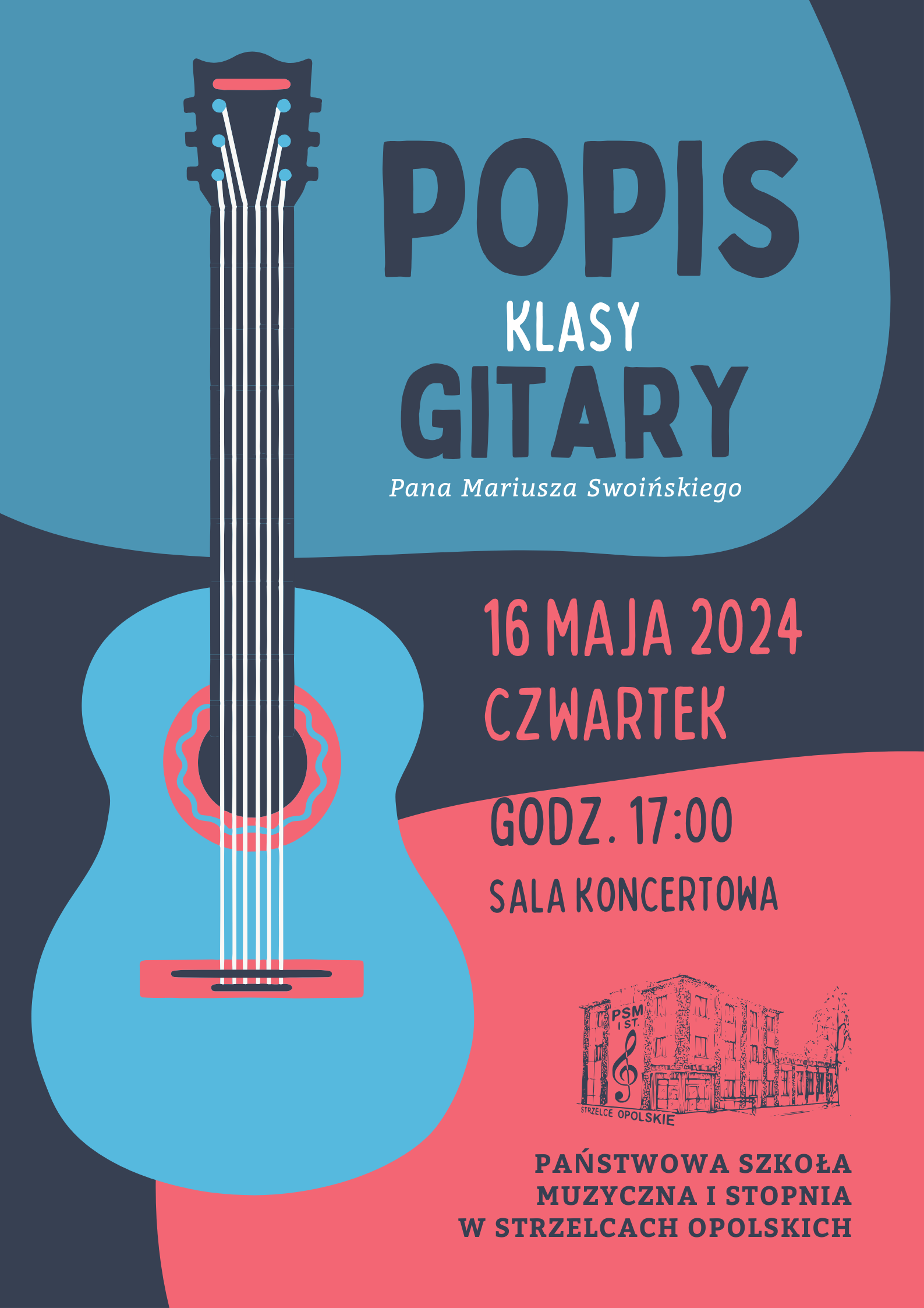 Niebiesko różowe tło z gitarą, zaproszenie na popis klasy gitary