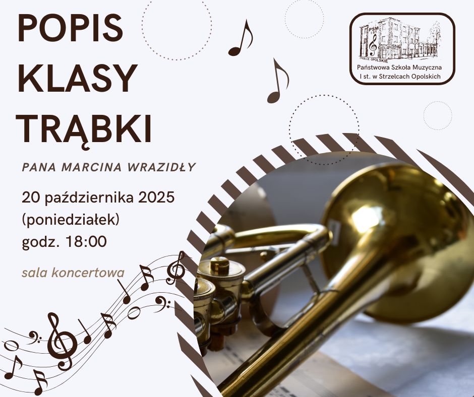 Popis klasy trąbki pana m. Wrazidły 20 października 2025 o godz. 18:00 w sali koncertowej. W prawym górnym rogu logo szkoły, zdjęcie trąbki, nutki.