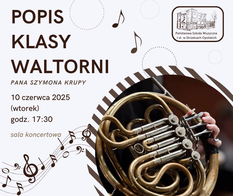 Popis klasy waltorni pana Szymona Krupy 10 czerwca 2025 o godz. 17:30 w sali koncertowej, grafika zdjęcie waltoni i logo szkoły