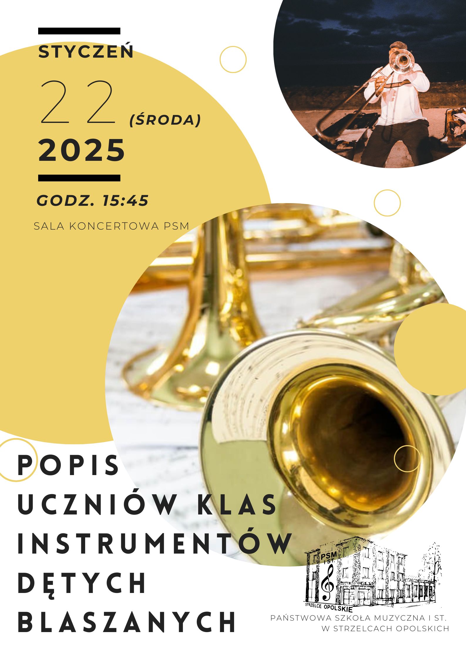 Bało musztardowe tło, zdjęcia trąbki i puzonisty, logo szkoły, zaproszenie na popis uczniów klas instrumentów dętych blaszanych 22 stycznia godz. 15:45