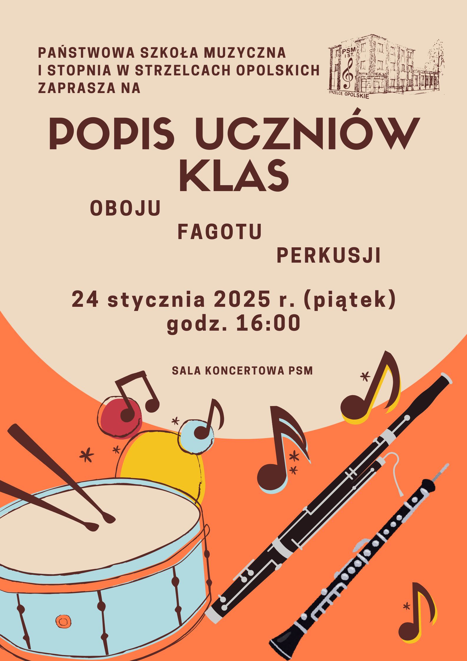 Beżowo pomarańczowe tło, grafika perkusja, obój, fagot oraz nutki. Zaproszenie na popis uczniów klas oboju, fagotu i perkusji 24 stycznia o godz. 16