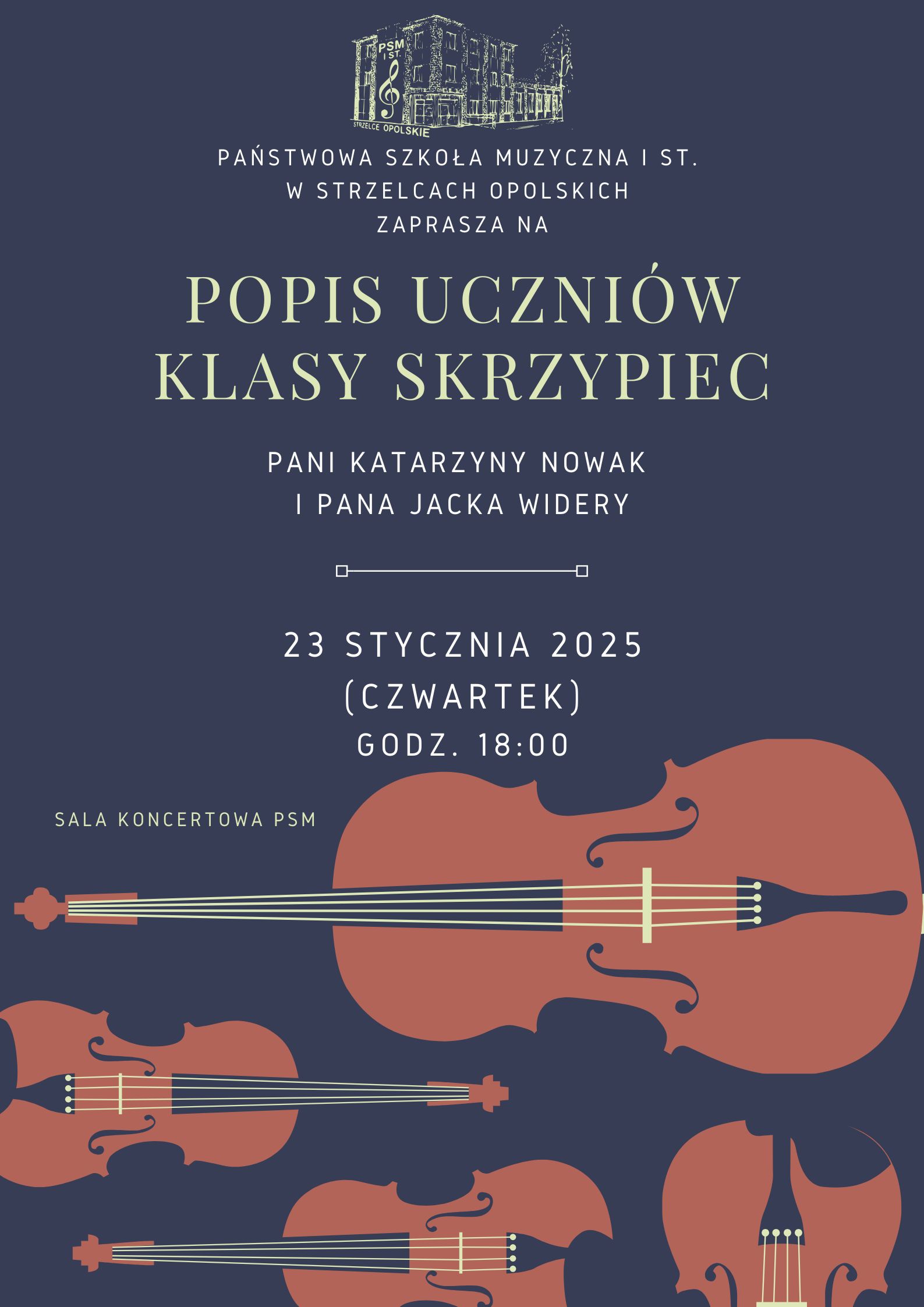 Granatowe tło, skrzypce, logo szkoły, zaproszenie na popis uczniów klasy skrzypiec p. Nowak i p. Widery 23 stycznia godz. 18:00