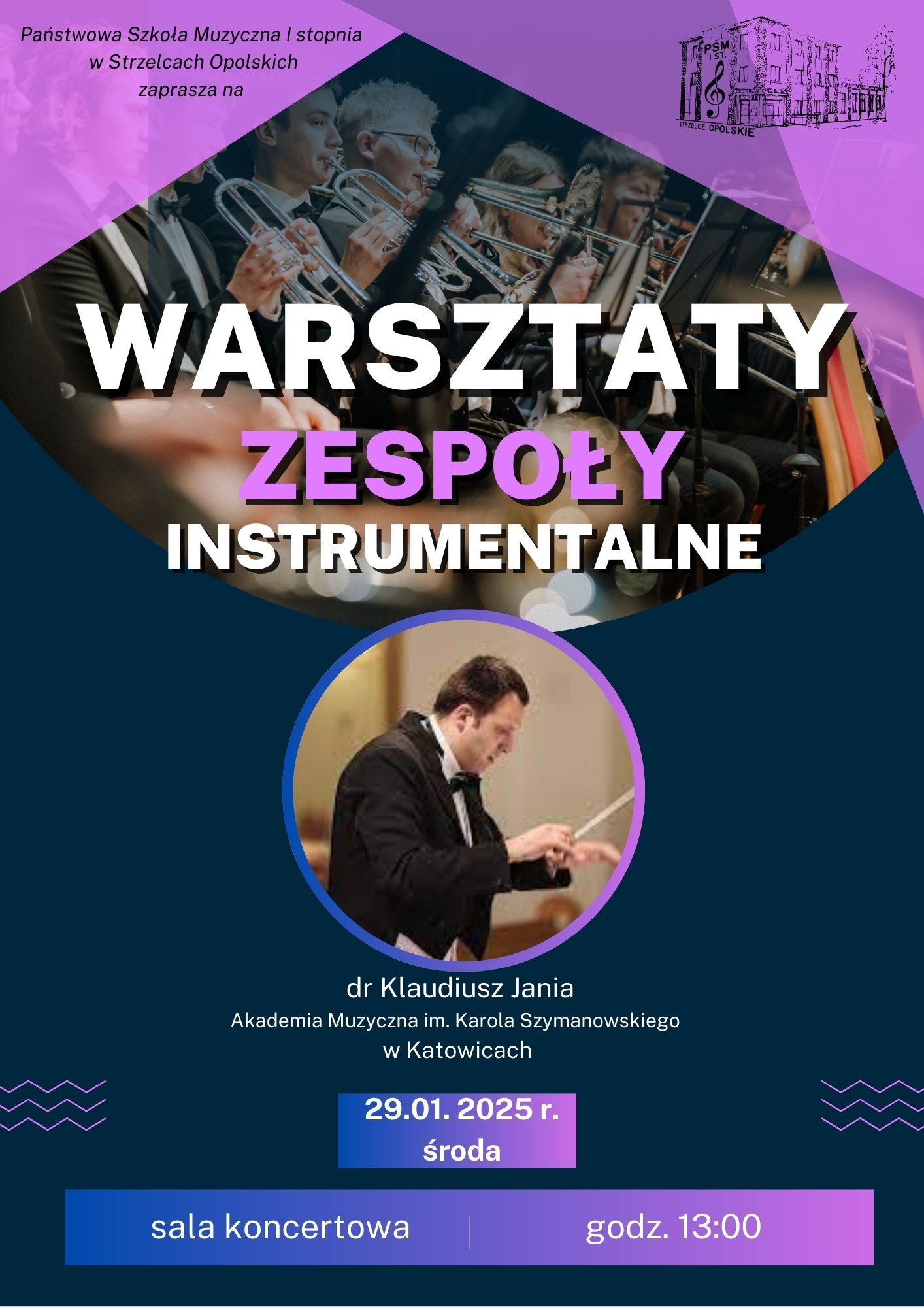 Granatowo - fioletowe tło, u góry Warsztaty zespoły instrumentalne "Kapelmistrz jako dyrygent, animator, aranżer i bandlider" dr Klaudiusz Jania, 29 stycznia godz. 13.00