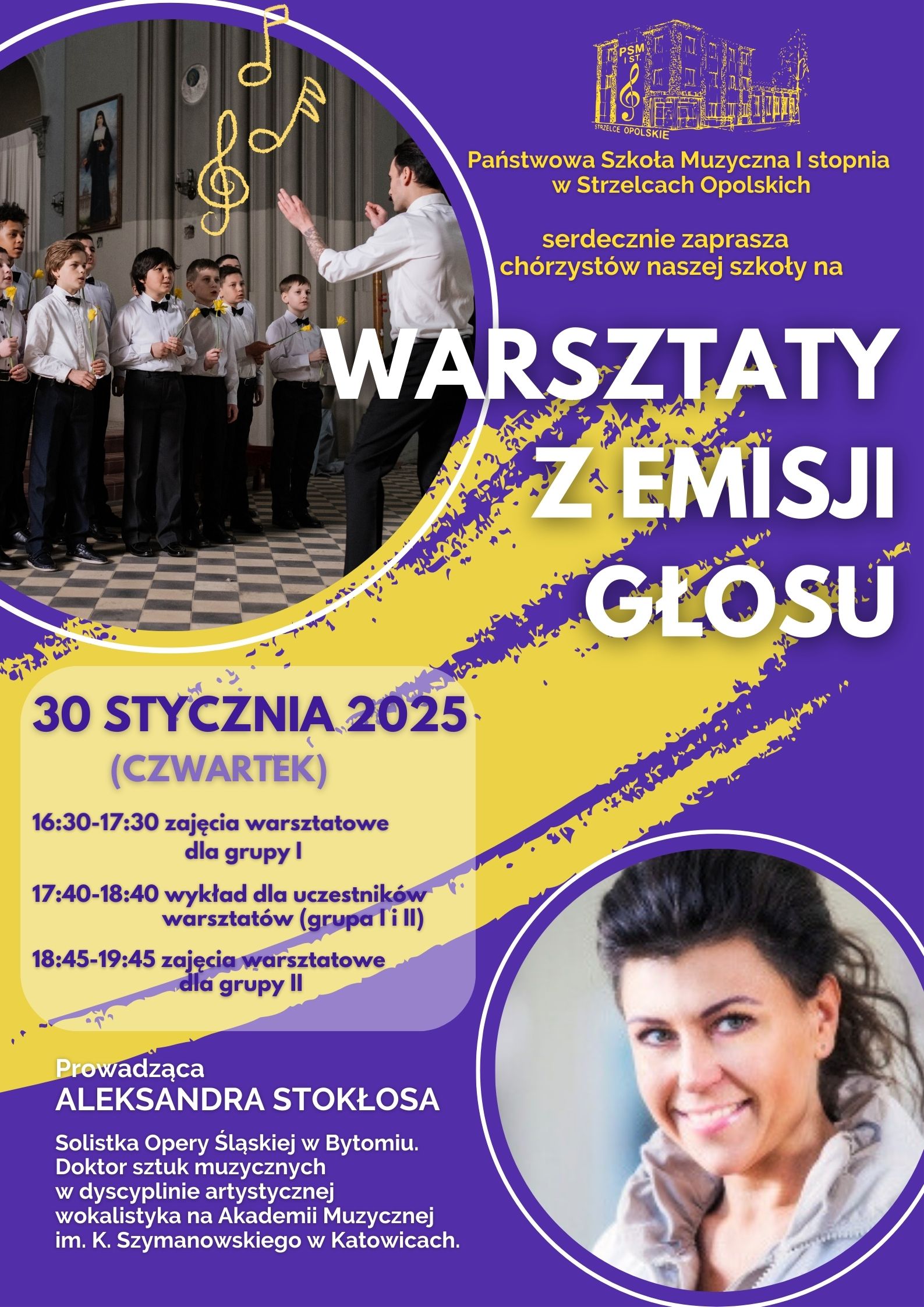 Na fioletowym tle u góry logo szkoły, w lewym górnym rogu zdjęcie chóru a u dołu prowadzącej warsztaty, zaproszenie na warsztaty z emisji głosu 30 stycznia 2025.