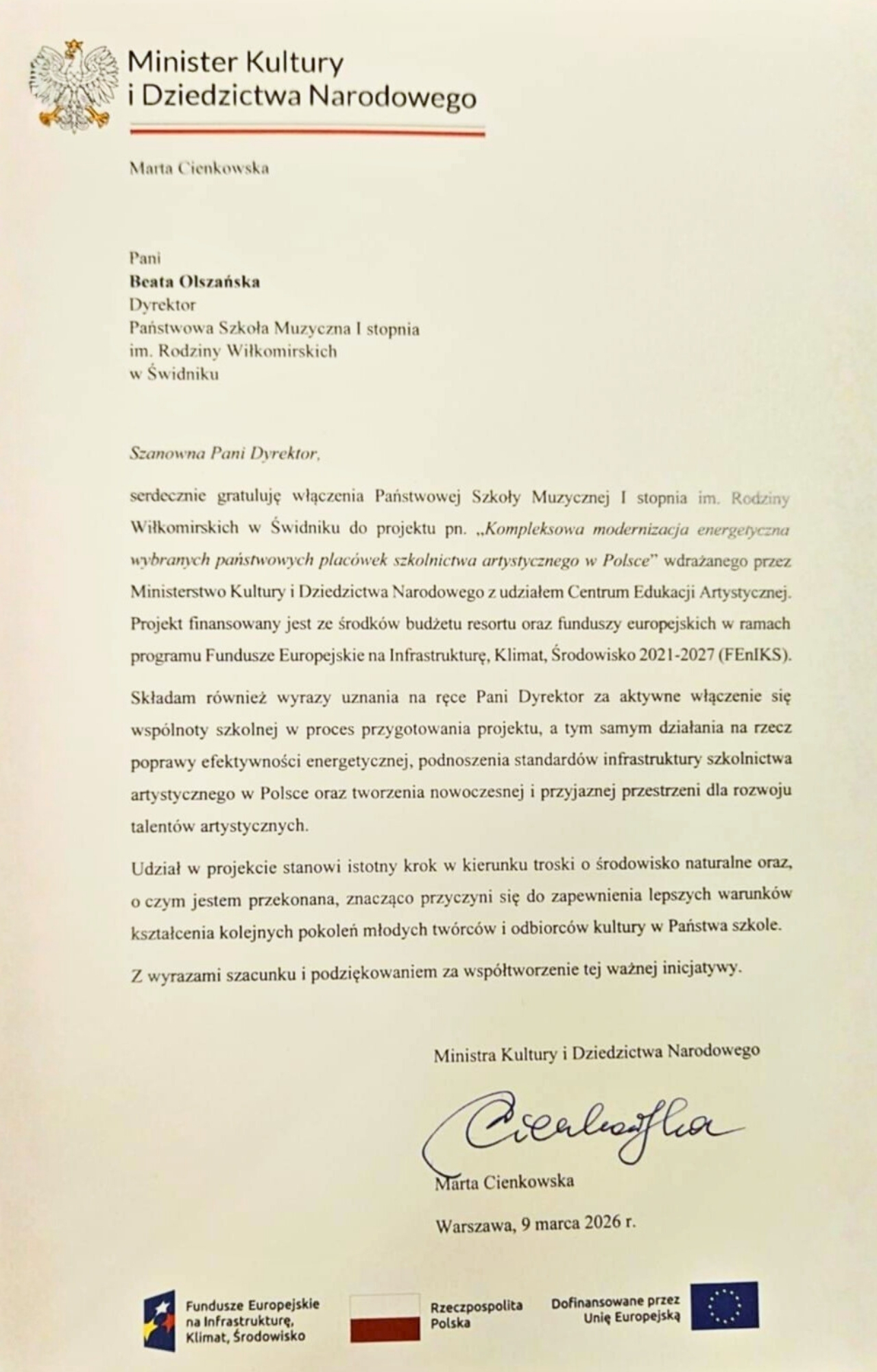 Z dumą i radością informujemy, że Państwowa Szkoła Muzyczna I stopnia im. Rodziny Wiłkomirskich w Świdniku została zakwalifikowana do prestiżowego projektu: „Kompleksowa modernizacja energetyczna wybranych państwowych placówek szkolnictwa artystycznego w Polsce”.
