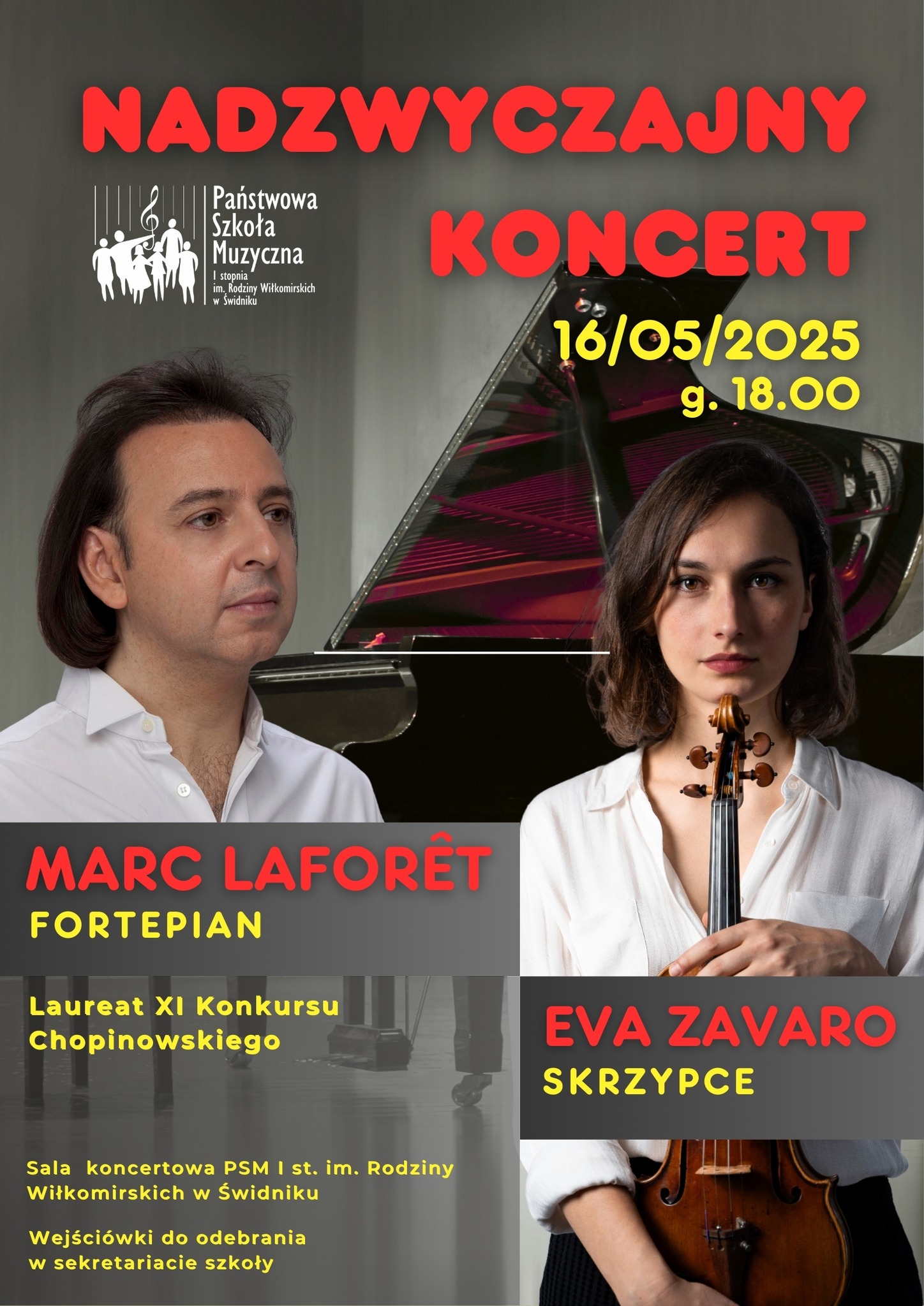 Serdecznie zapraszamy na wyjątkowy koncert w wykonaniu Marc'a Laforêt'a oraz Evy Zavaro w dniu 16 maja 2025 r. o g. 18.00 w sali koncertowej szkoły.