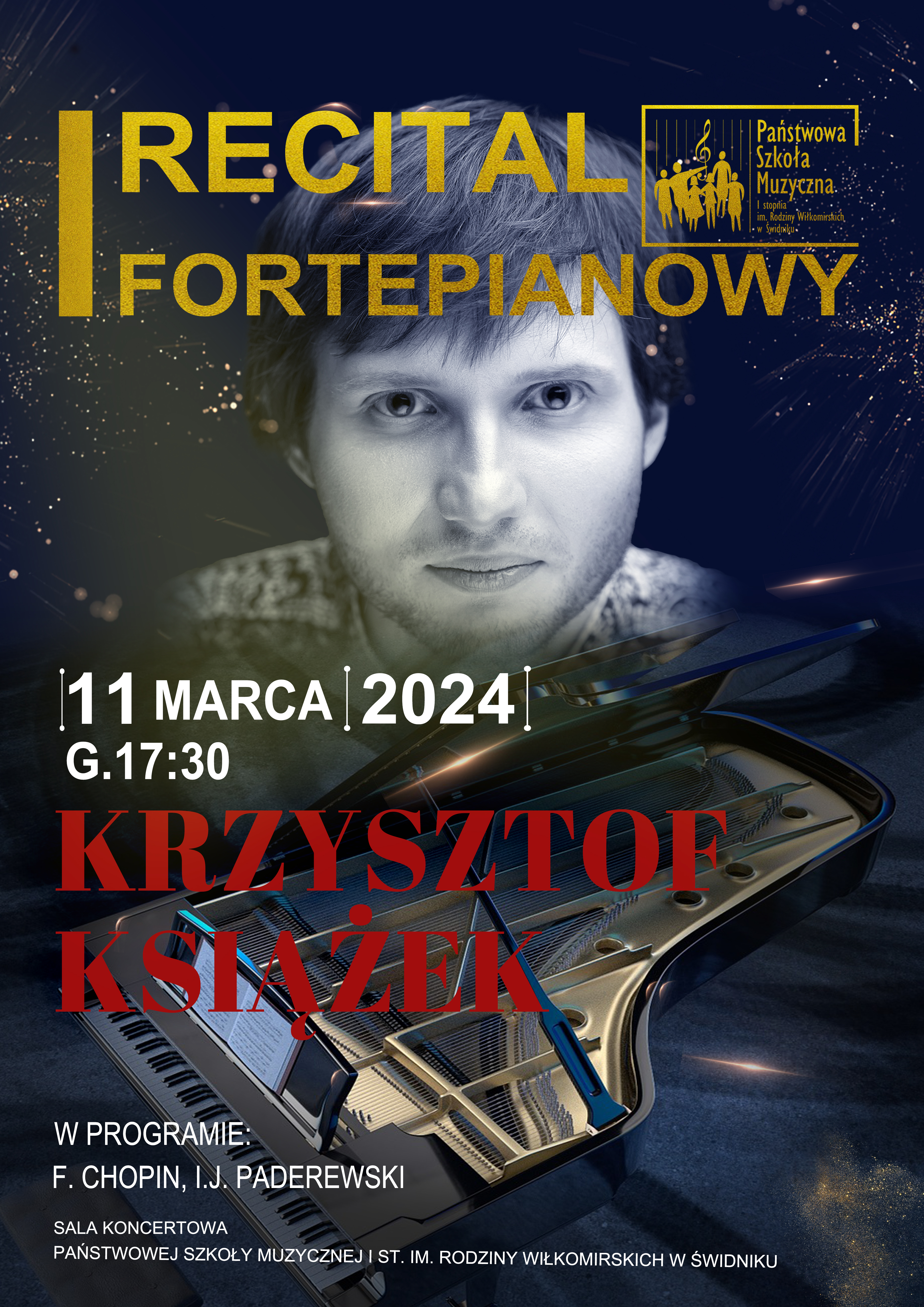 11 marca 2024 roku o godzinie 17.30 w naszej nowej Sali Koncertowej wystąpi z recitalem fenomenalny pianista Krzysztof Książek - półfinalista i laureat dwóch nagród pozaregulaminowych w XVII Międzynarodowym Konkursie im. Fryderyka Chopina w Warszawie (2015) oraz laureat III nagrody i nagrody specjalnej za najlepsze wykonanie mazurków I Międzynarodowego Konkursu Chopinowskiego na Instrumentach Historycznych (2018).