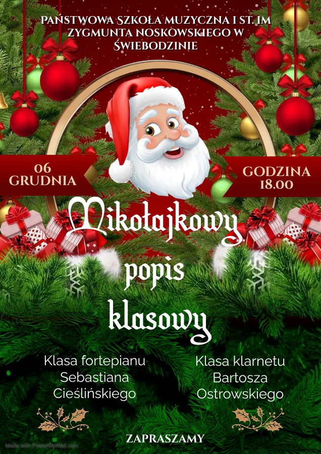 Serdecznie zapraszamy na łączony popis klasy fortepianu mgr Sebastiana Cieślińskiego oraz klasy klarnetu mgr Bartosza Ostrowskiego, który odbędzie się w środę 6 grudnia o godzinie 18:00 w naszej Sali Koncertowej.