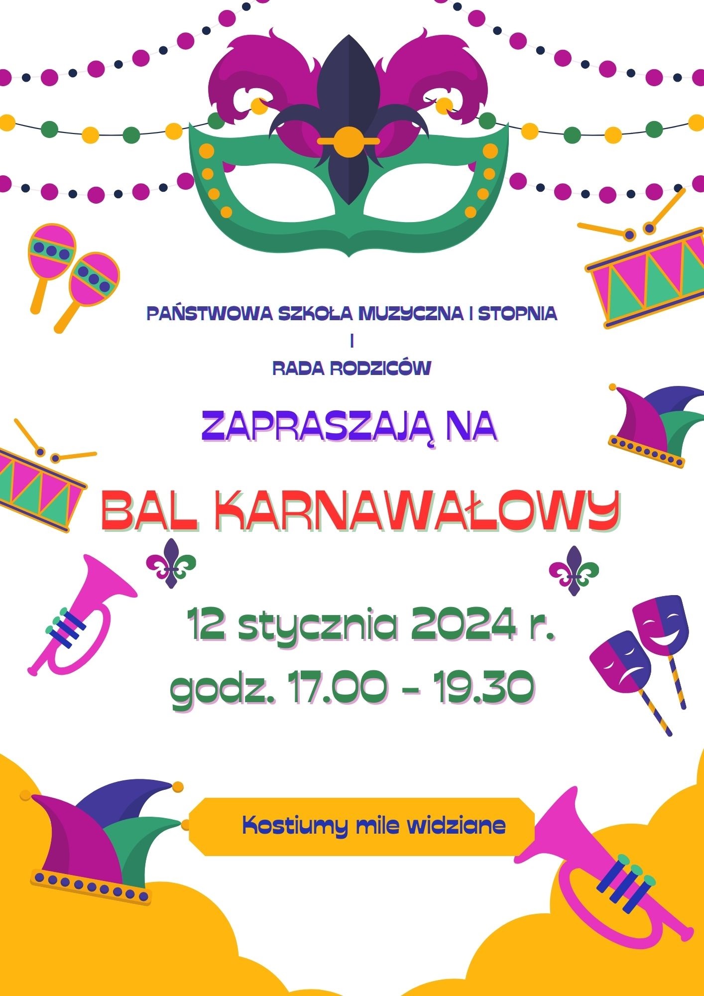 Państwowa Szkoła Muzyczna I stopnia w Świnoujściu i Rada Rodziców zapraszają na bal karnawałowy, który odbędzie się 12 stycznia 2024 r. o godzinie 17:00 -19:30.