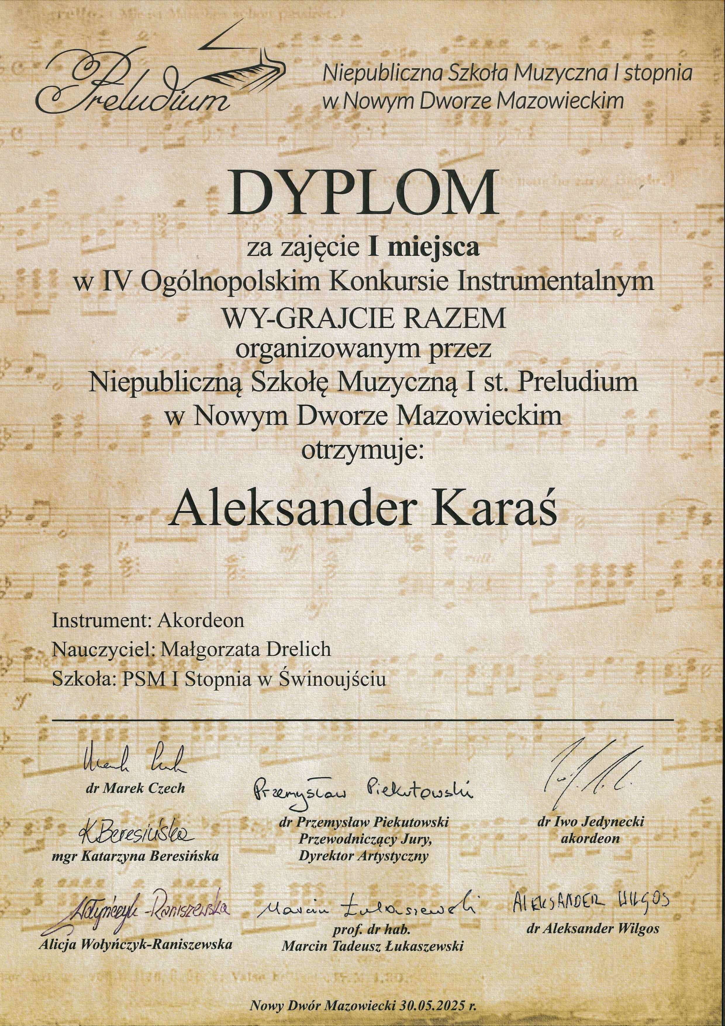 Dyplom za zajęcie I miejsca w IV Ogólnopolskim Konkursie Instrumentalnym WY - GRAJCIE RAZEM dla ucznia klasy akordeonu Aleksandra Karasia.