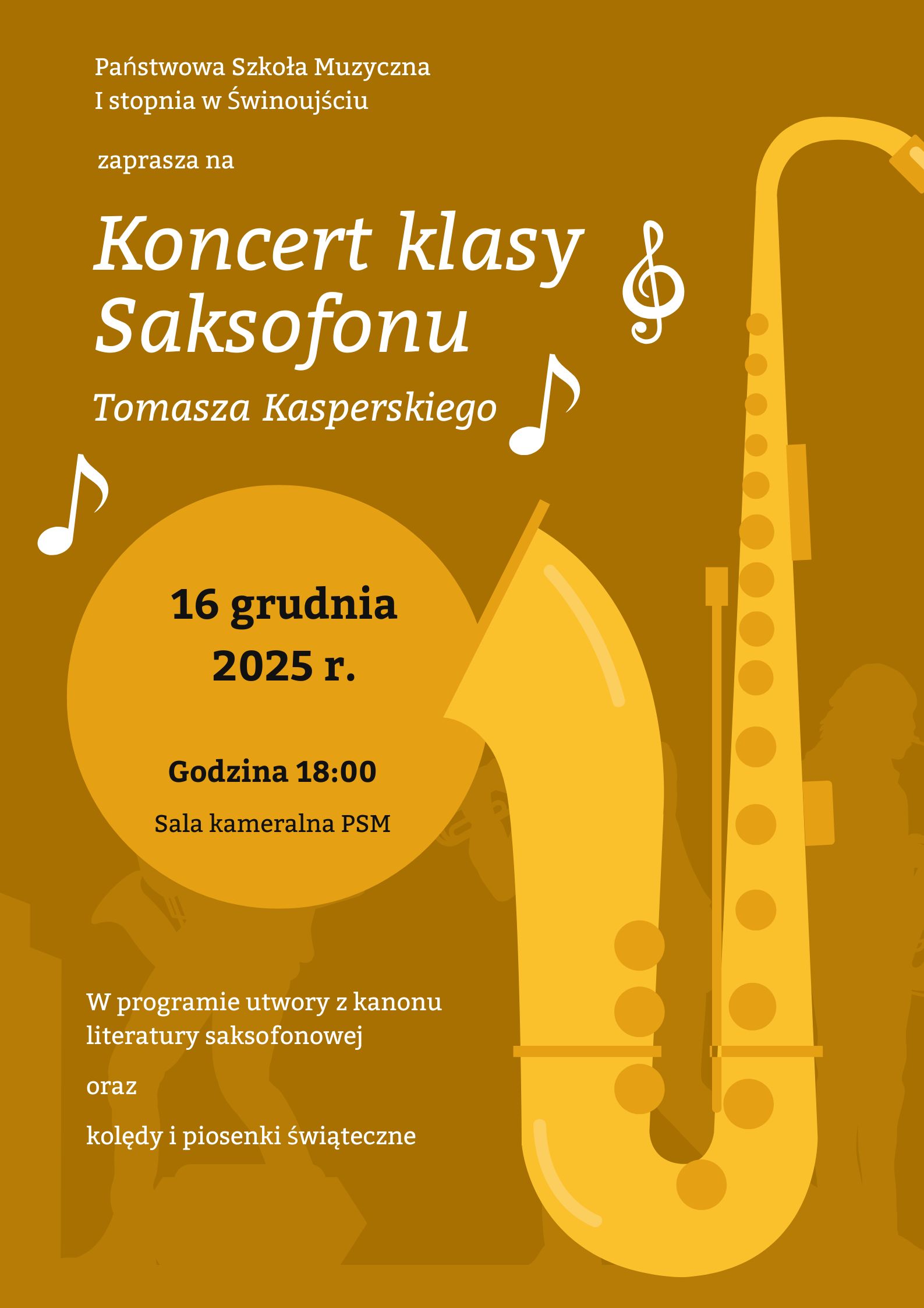 Serdecznie zapraszamy na koncert, na którym zaprezentują się uczniowie klasy saksofonu pana Tomasza Kasperskiego.