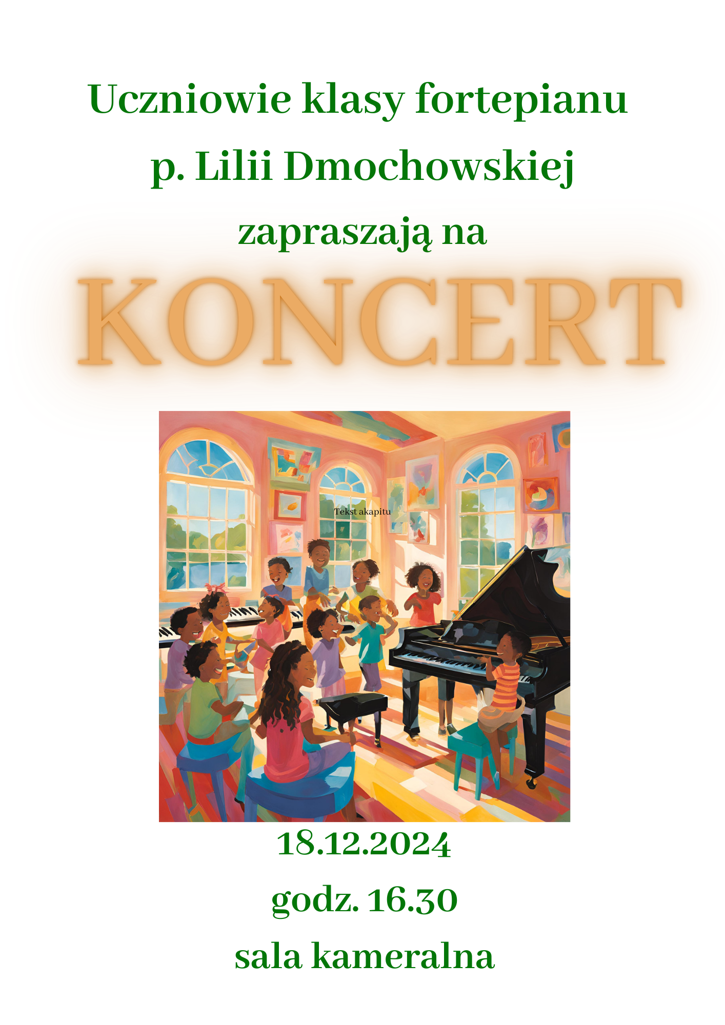 W dniu 18 grudnia 2024 r. o godzinie 16:30 zapraszamy na koncert grudniowy uczniów fortepianu, który odbędzie się na sali kametalnej szkoły.